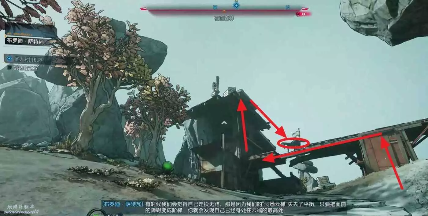 接著移動到第二個指引點,從右側攀爬至橋上,向左前方建築行進並繞至其最高處,跳躍至目標高台。