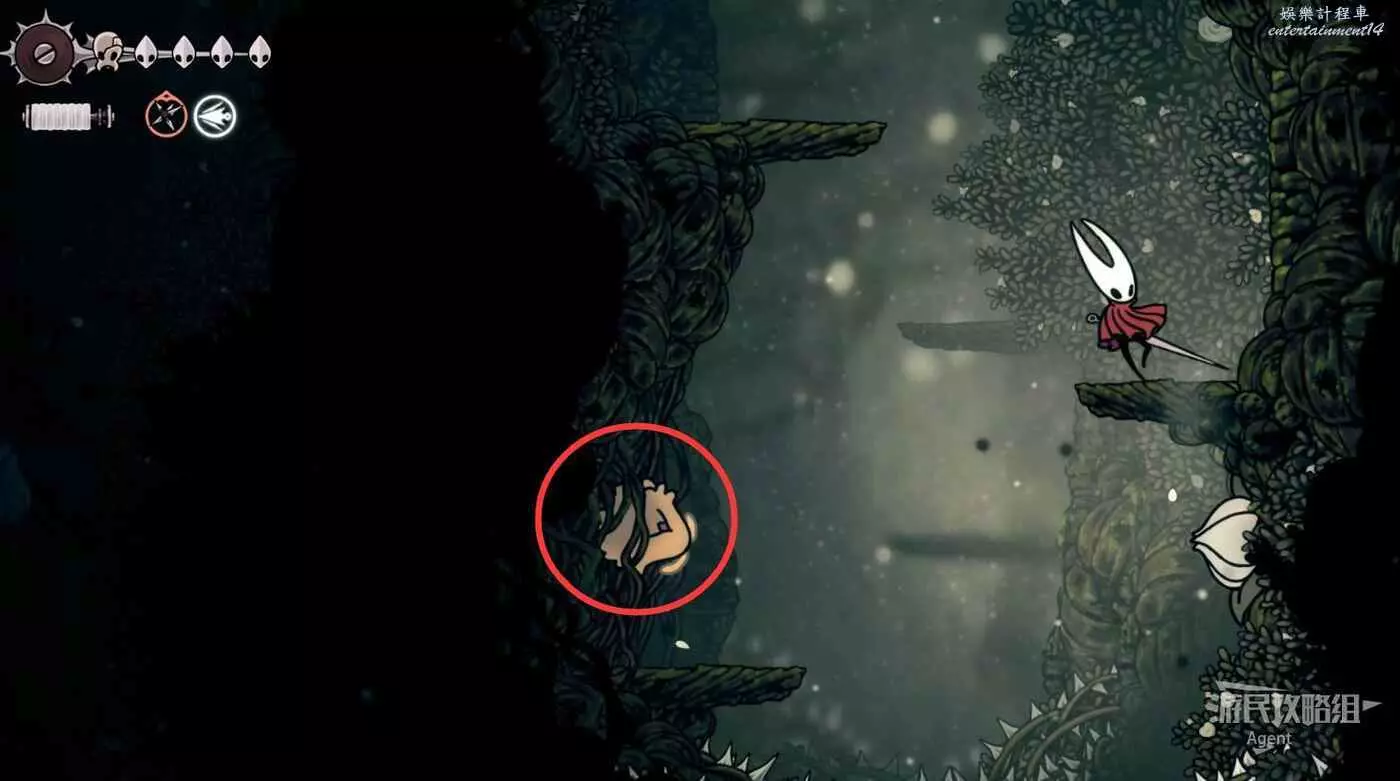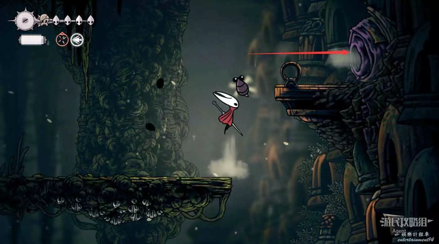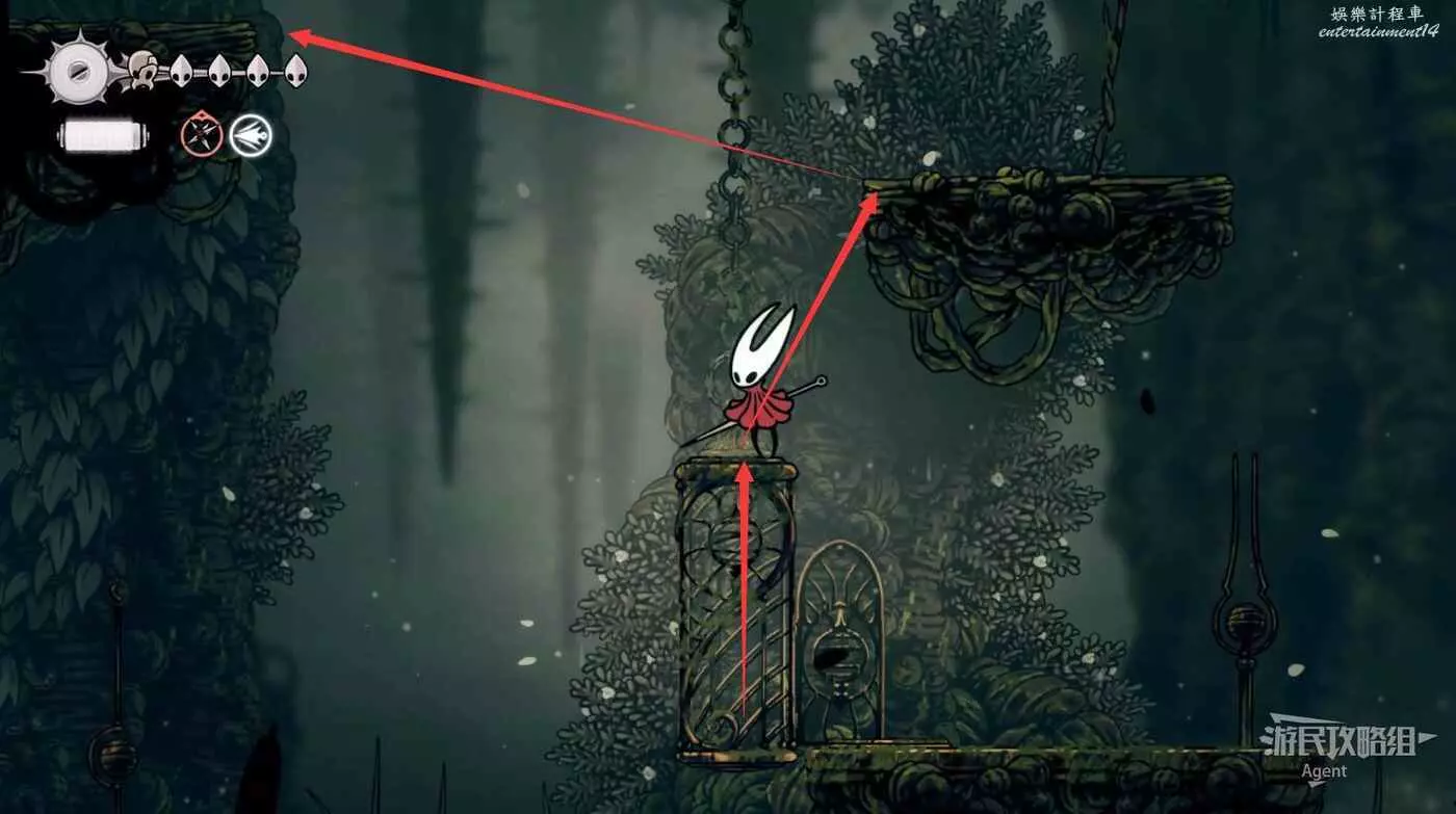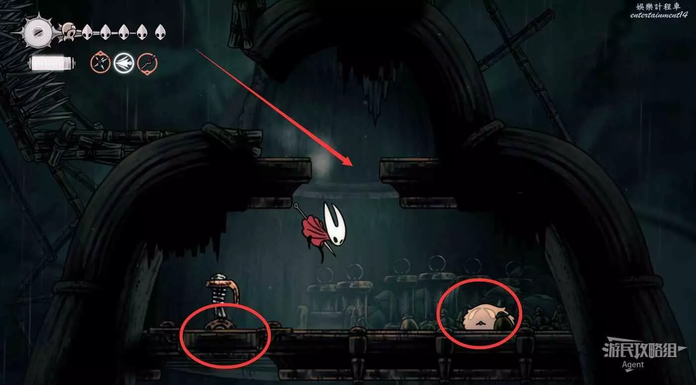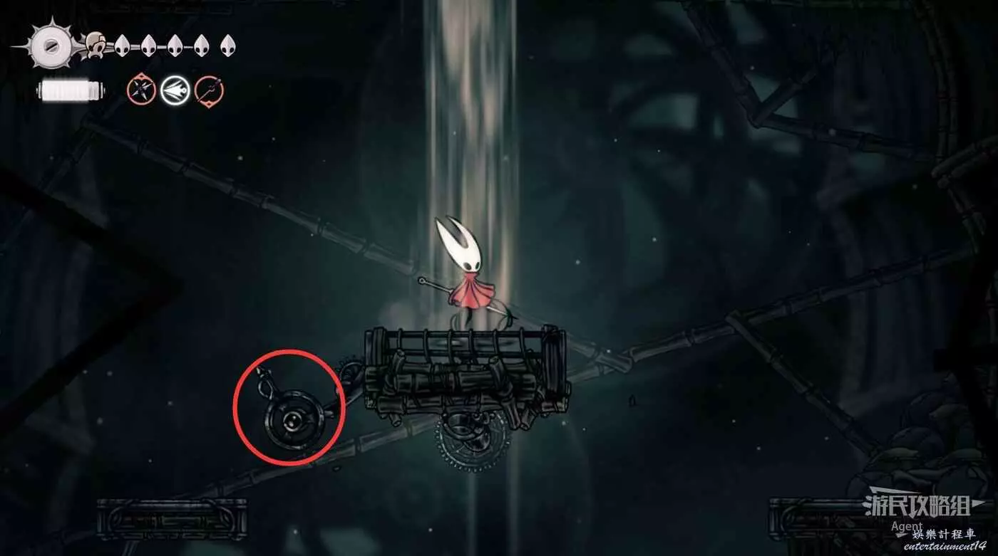 一直往右到長椅這邊的上層,先別敲機關放下橋,跳跳樂上到頂部有【靈絲軸碎片】。頂部往右有隱藏的區域,走到頭有種特殊的蟲子啟動圖鑒和一些甲殼碎片。