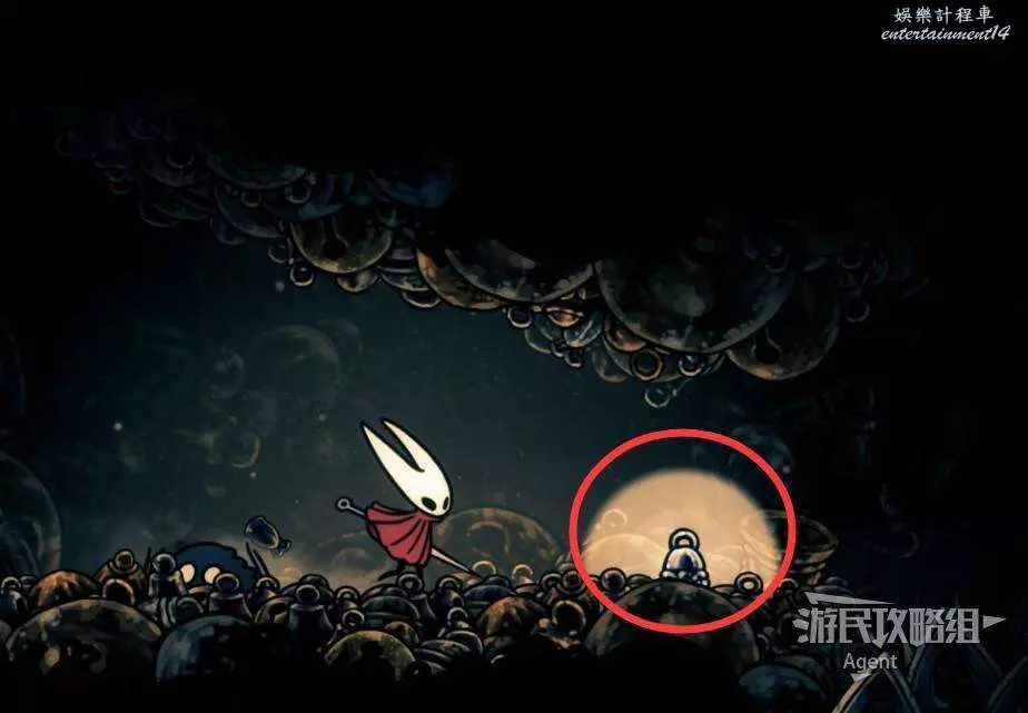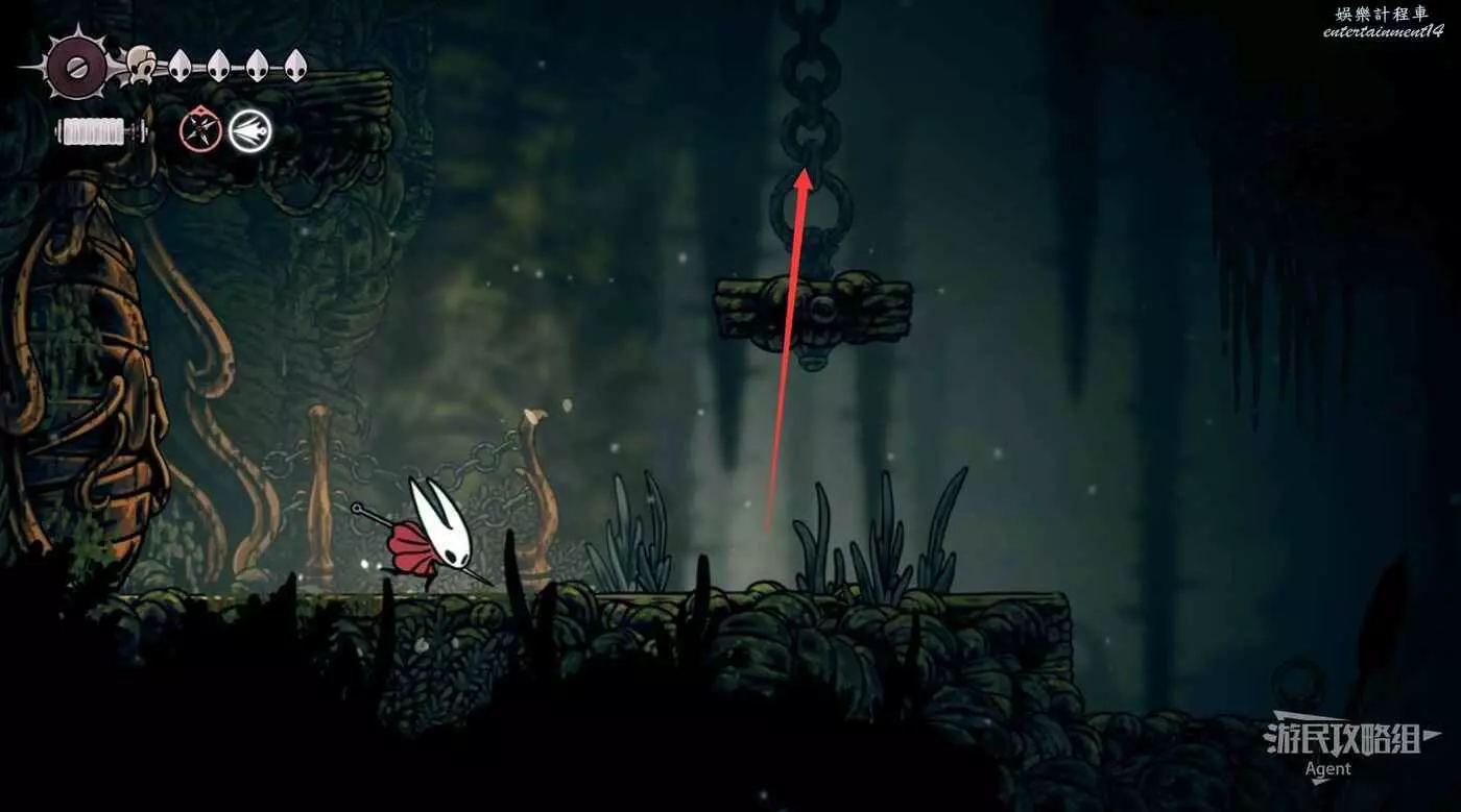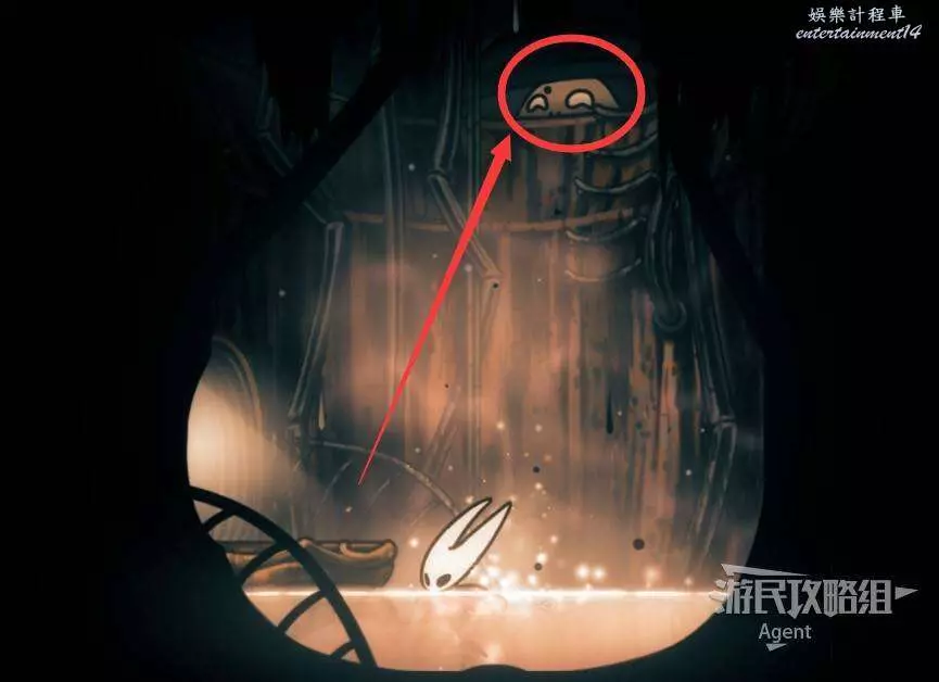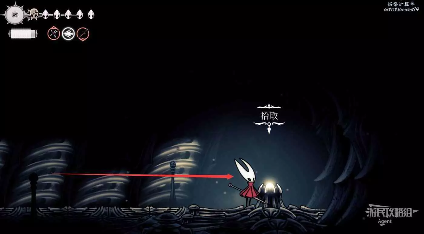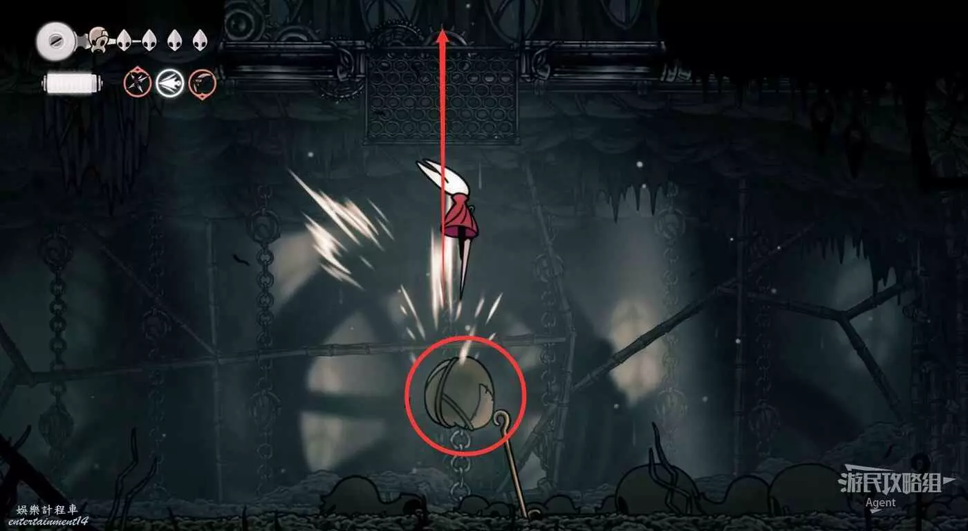 一直往右到長椅這邊的上層,先別敲機關放下橋,跳跳樂上到頂部有【靈絲軸碎片】。頂部往右有隱藏的區域,走到頭有種特殊的蟲子啟動圖鑒和一些甲殼碎片。
