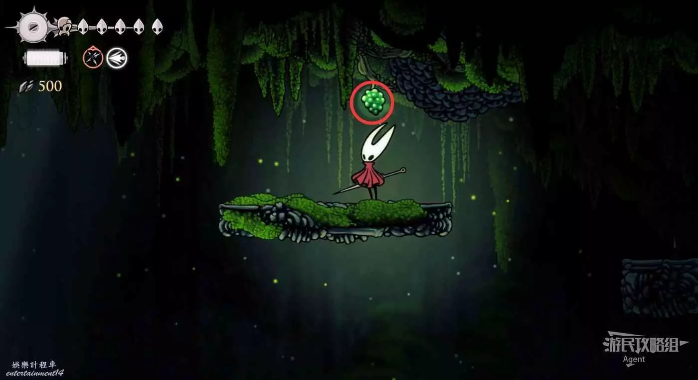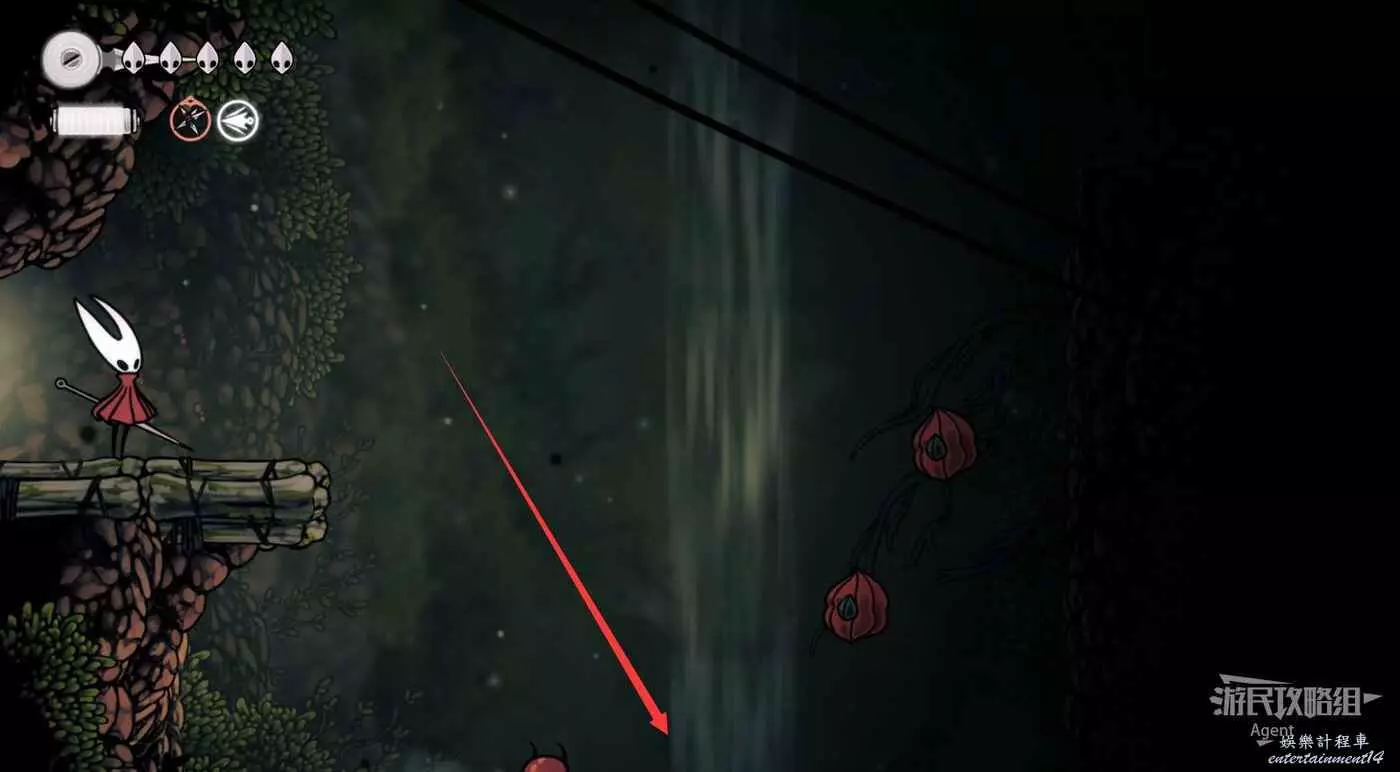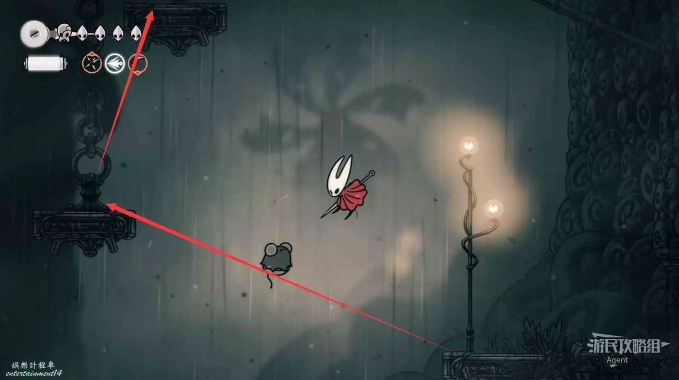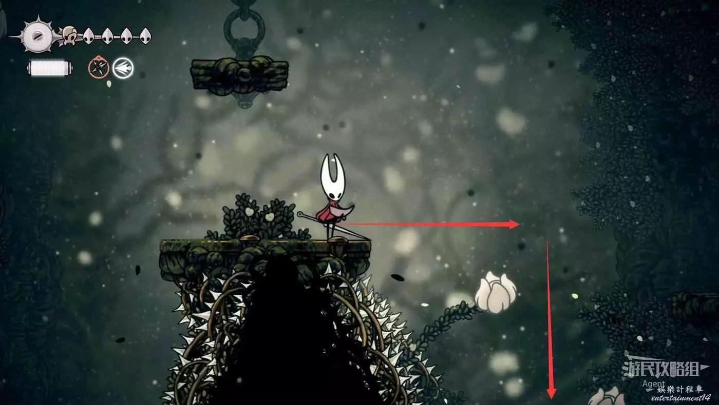 右側利用下劈飛蟲上到頂,有念珠和碎石包。如果覺得斜向下的下劈太難,可以等下獲得收割者紋章後再來會簡單很多。