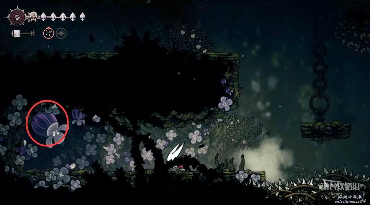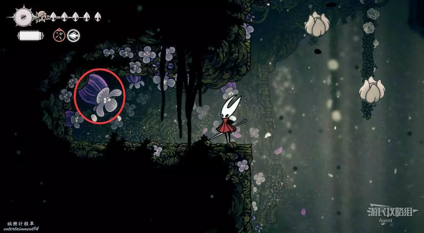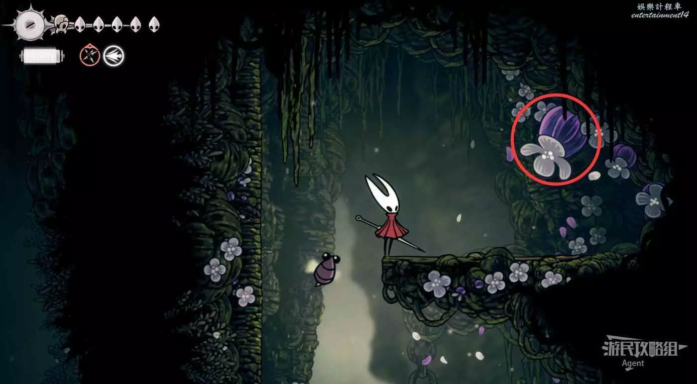 沿下圖路線爬牆上去,打碎紫色的飛蟲窩,下去打紫色的花得到花芯。