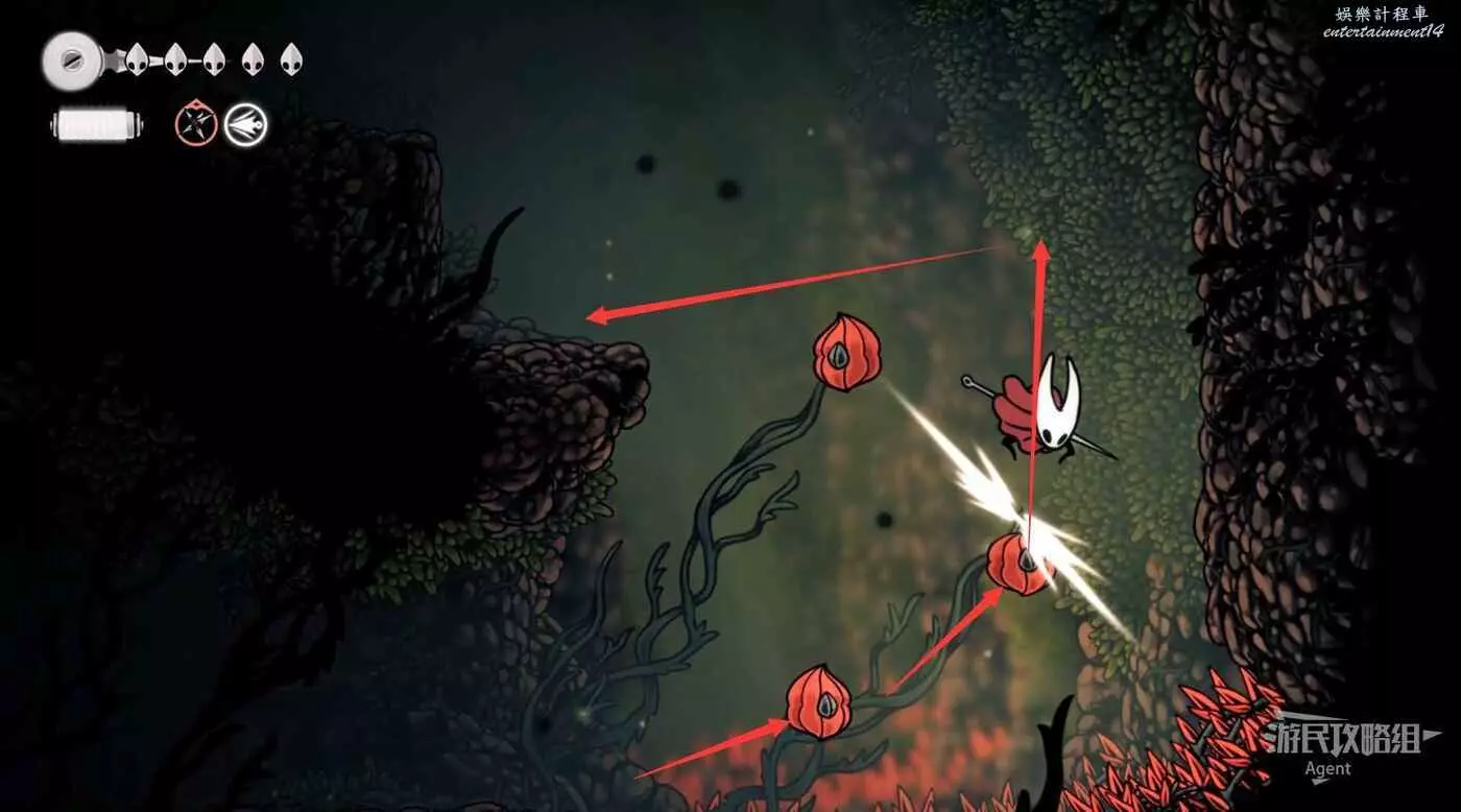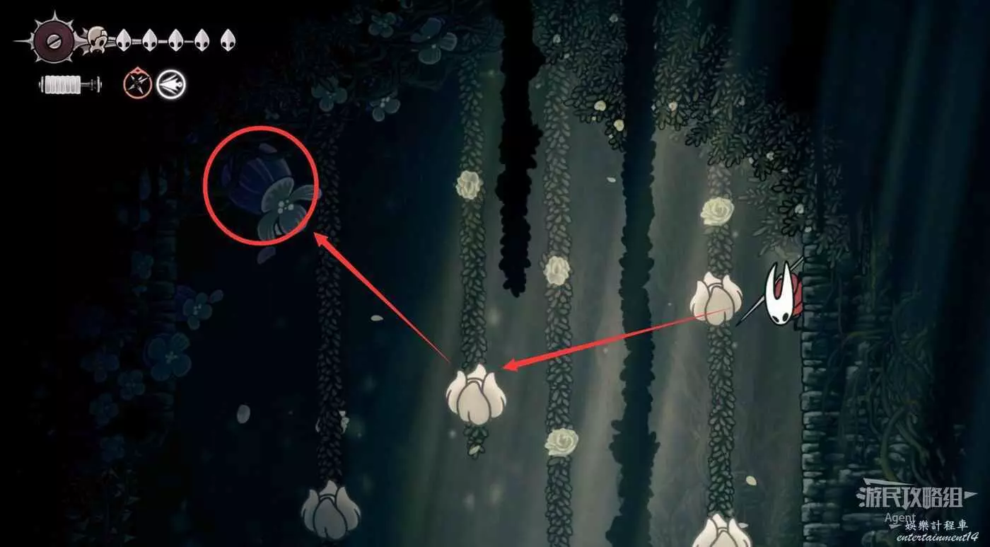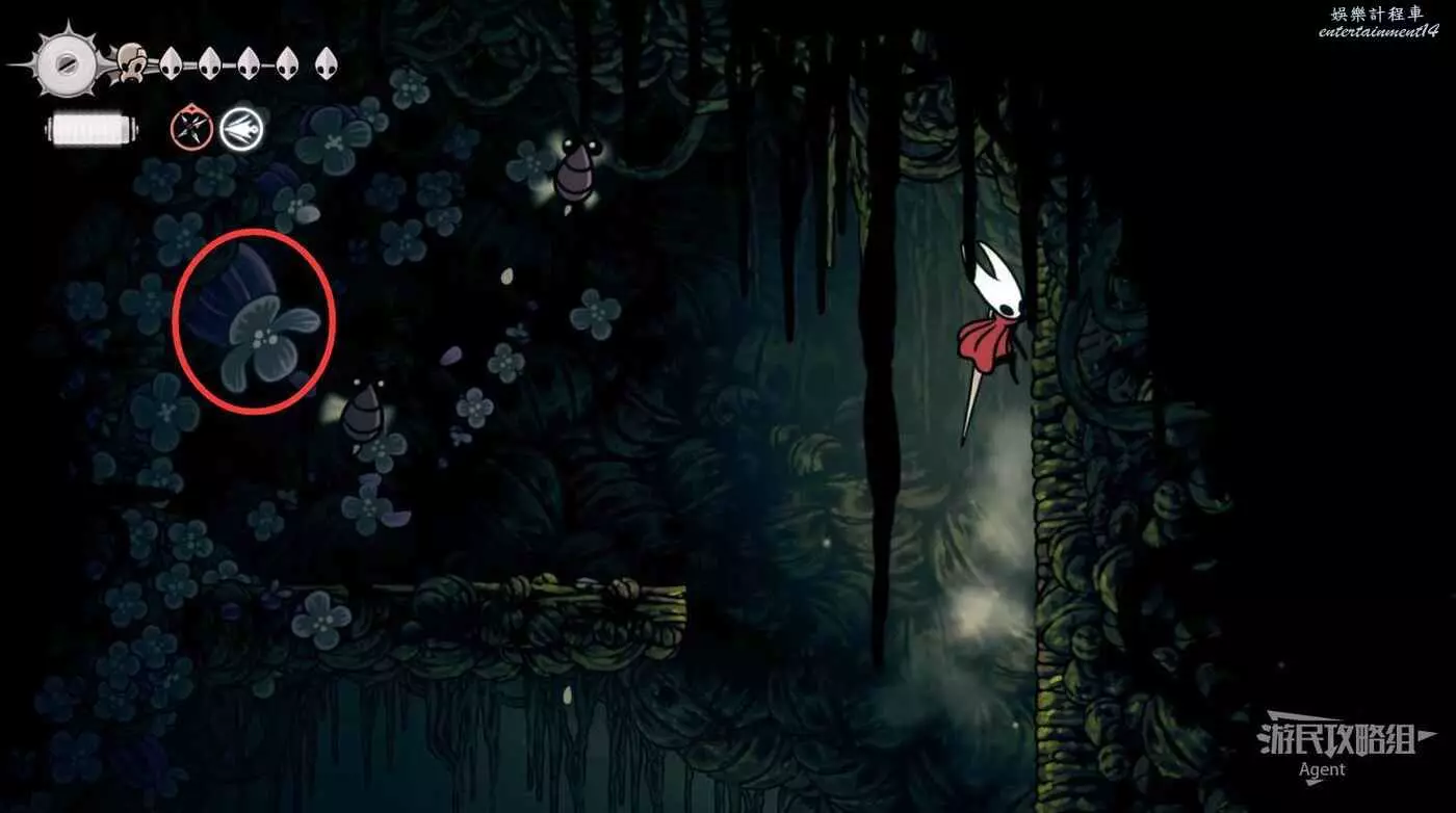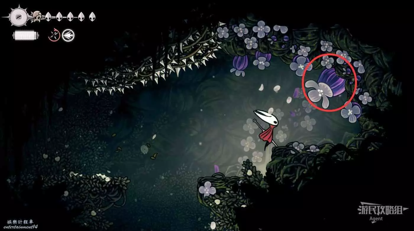 沿下圖路線爬牆上去,打碎紫色的飛蟲窩,下去打紫色的花得到花芯。