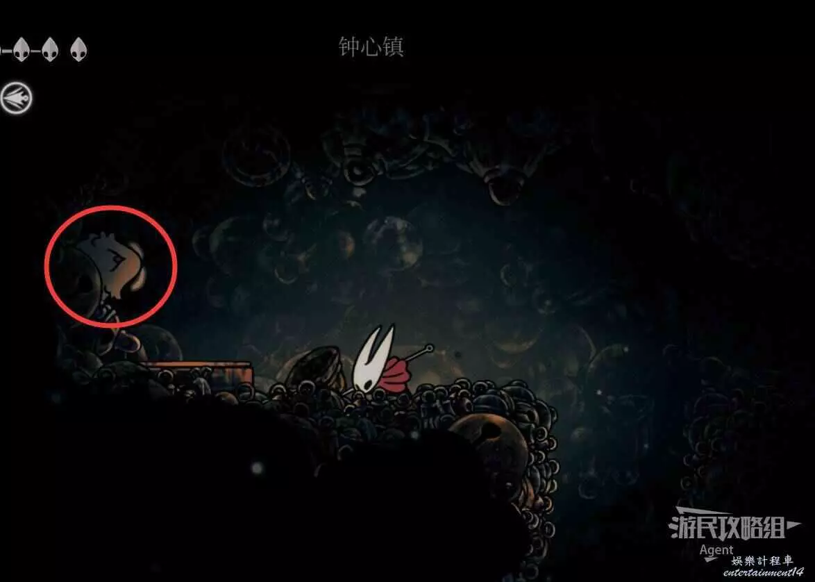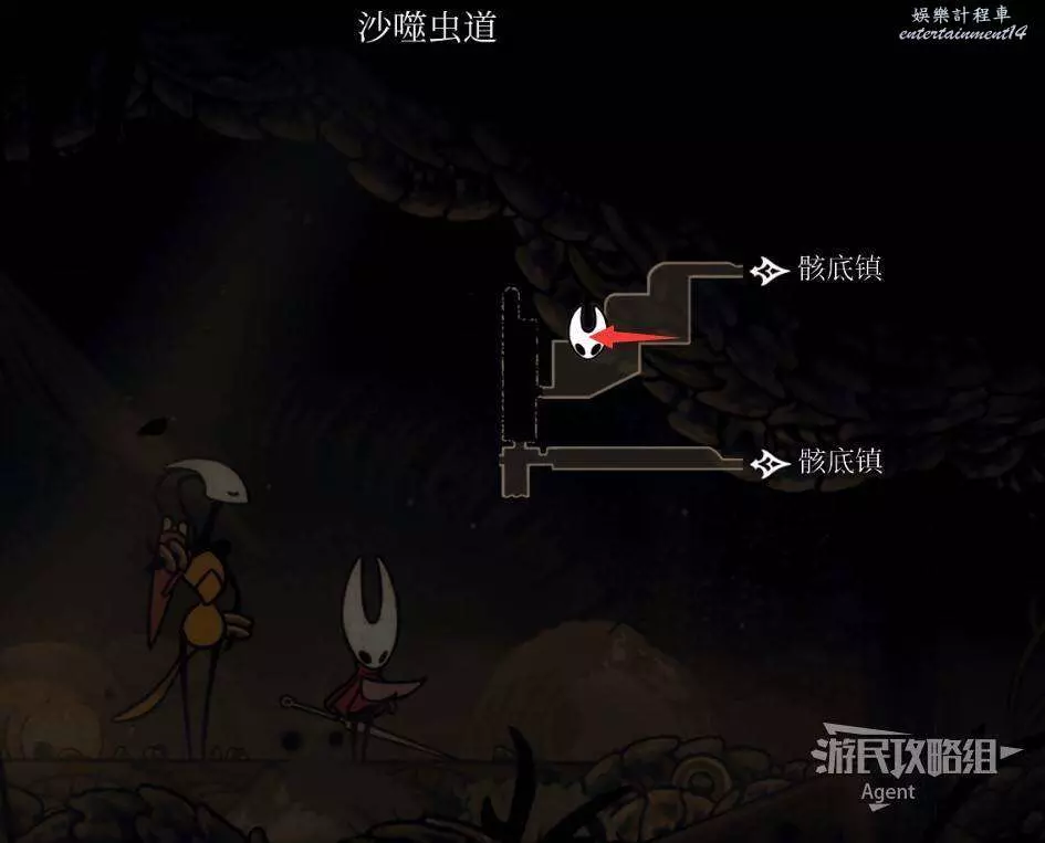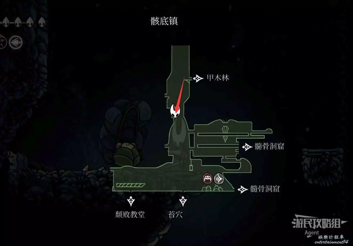 往左走,上面岔路有個念珠怪。一直往左走有長椅,左邊出去可通往骸底鎮上方的豎井。