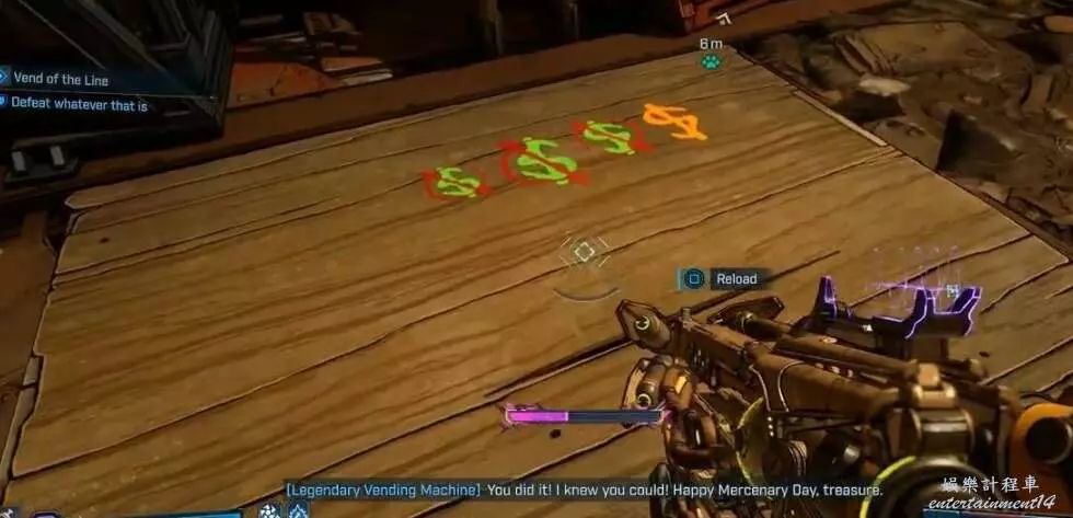 擊敗BOSS販賣機贊恩後,檢查進入洞穴時BOSS最初所在位置,木板上有3個被劃掉的綠色【$】圖示和1個未劃線的橙色【$】圖示,這意味著要在此販賣機出售3件綠色物品,再購買1件傳奇物品。