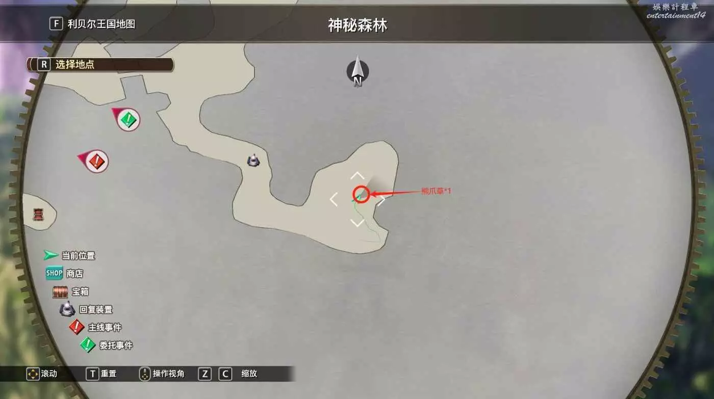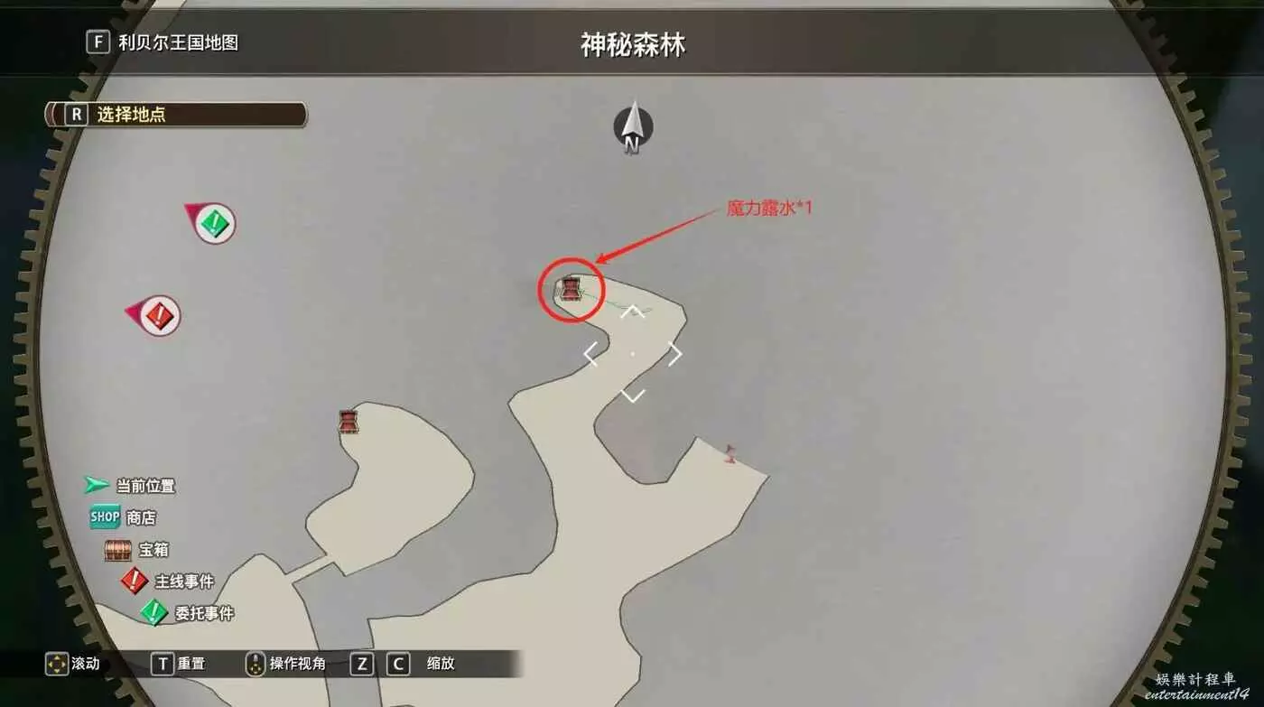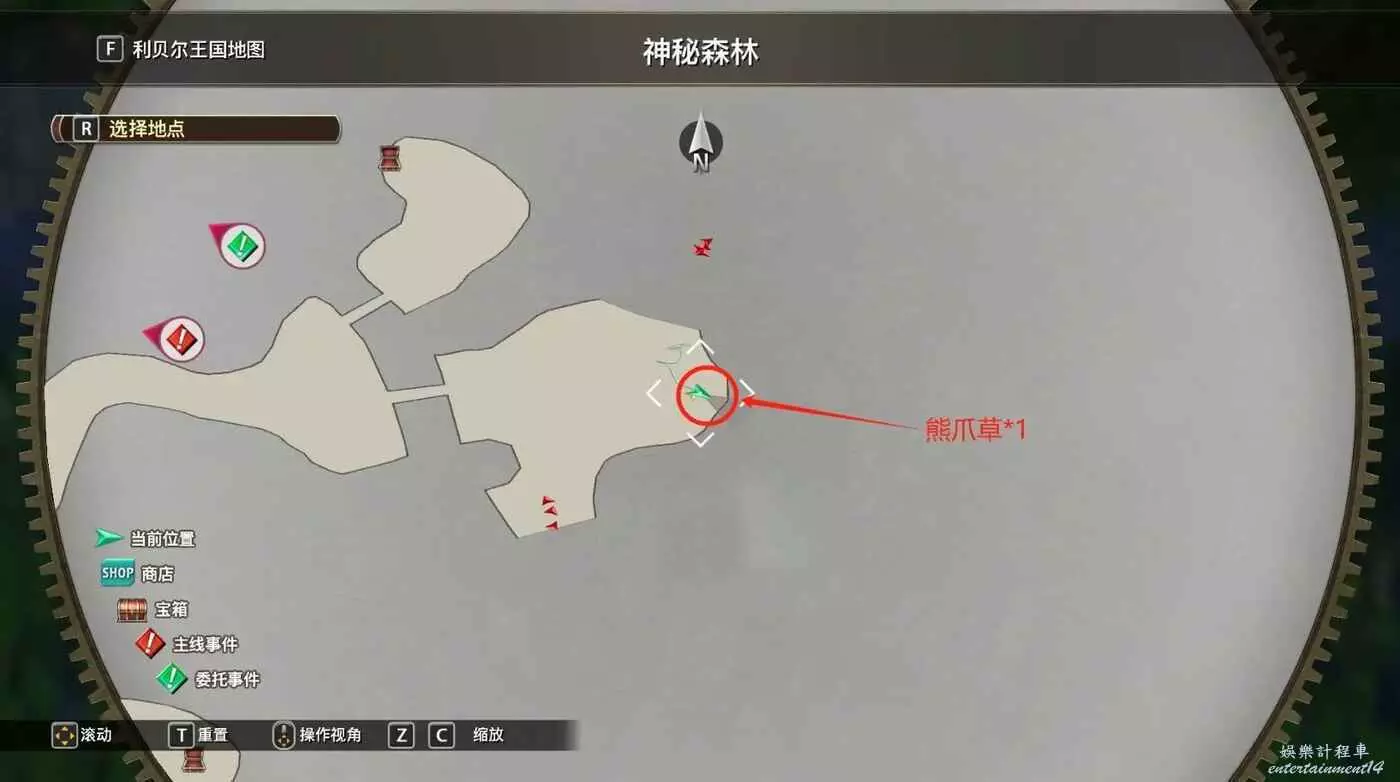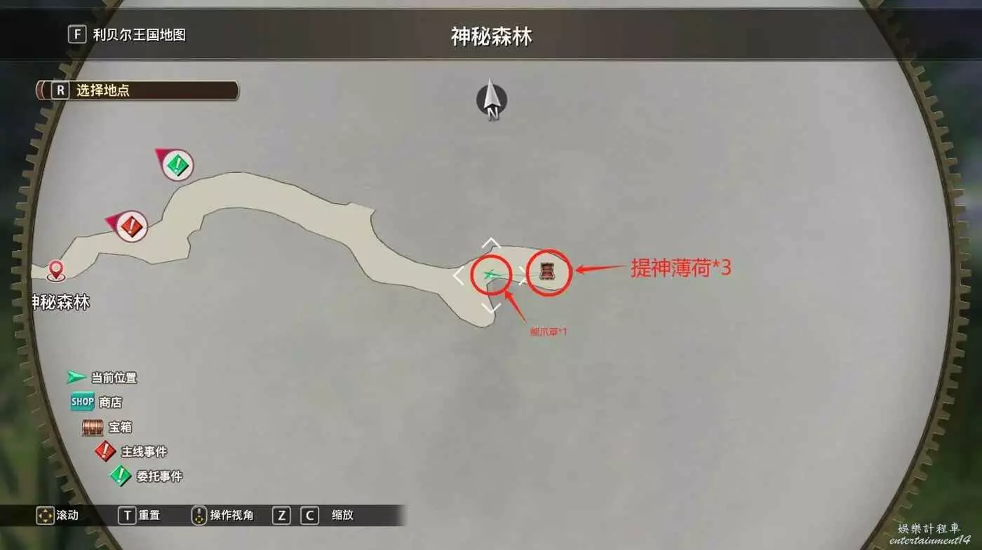 神秘森林第一個小岔路上有一個熊爪草和寶箱,調查寶箱可獲得提神薄荷*3