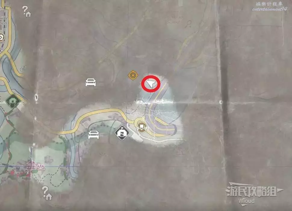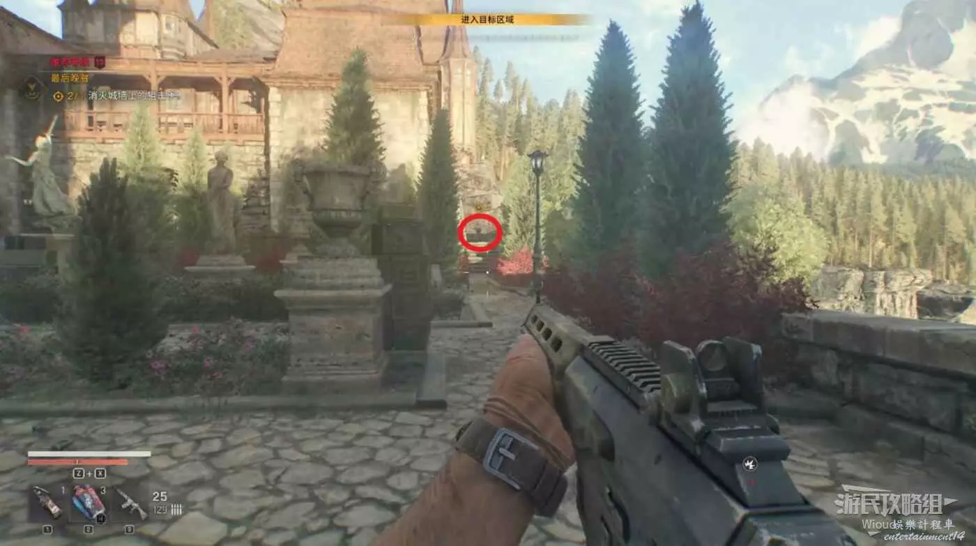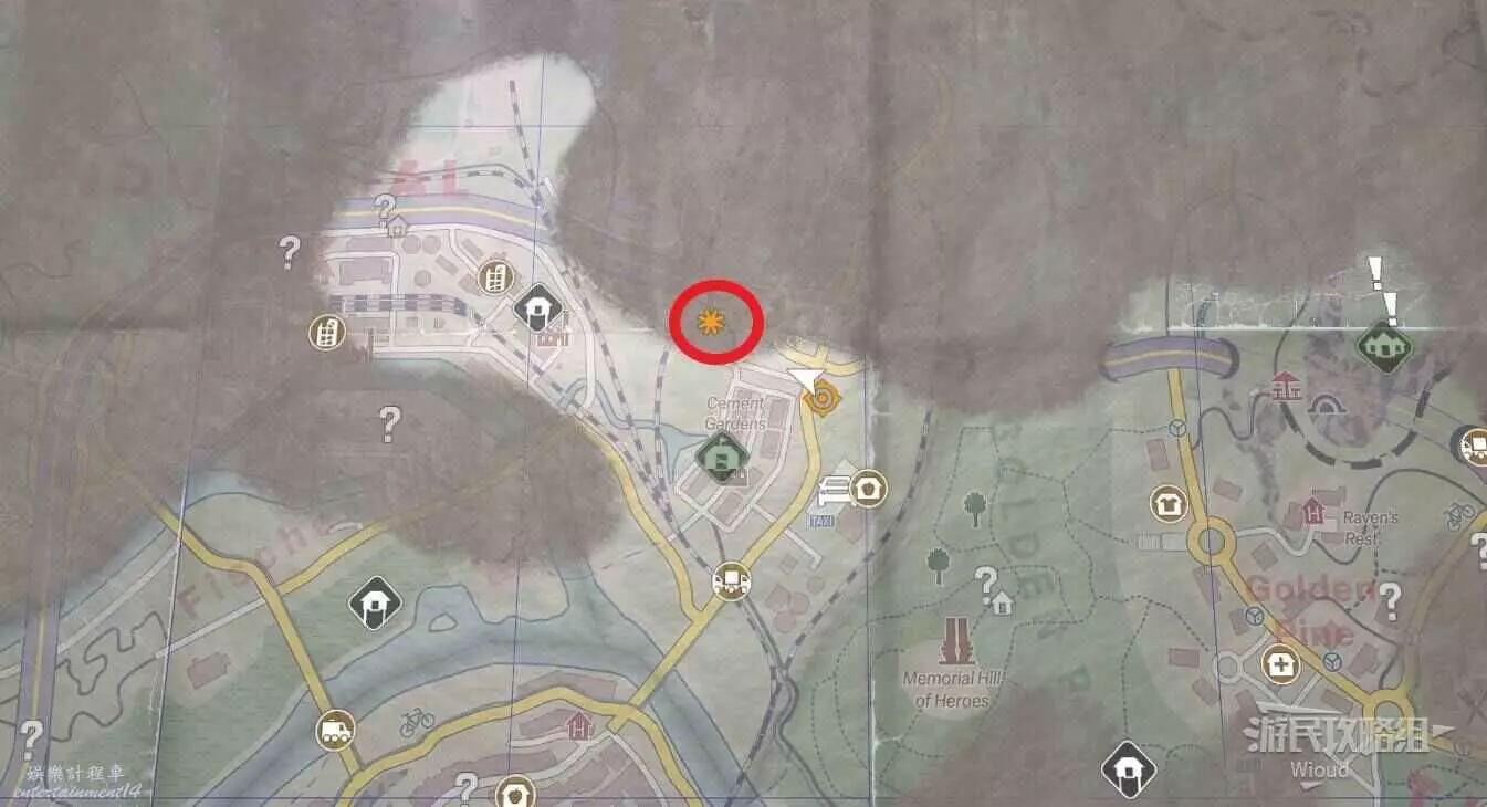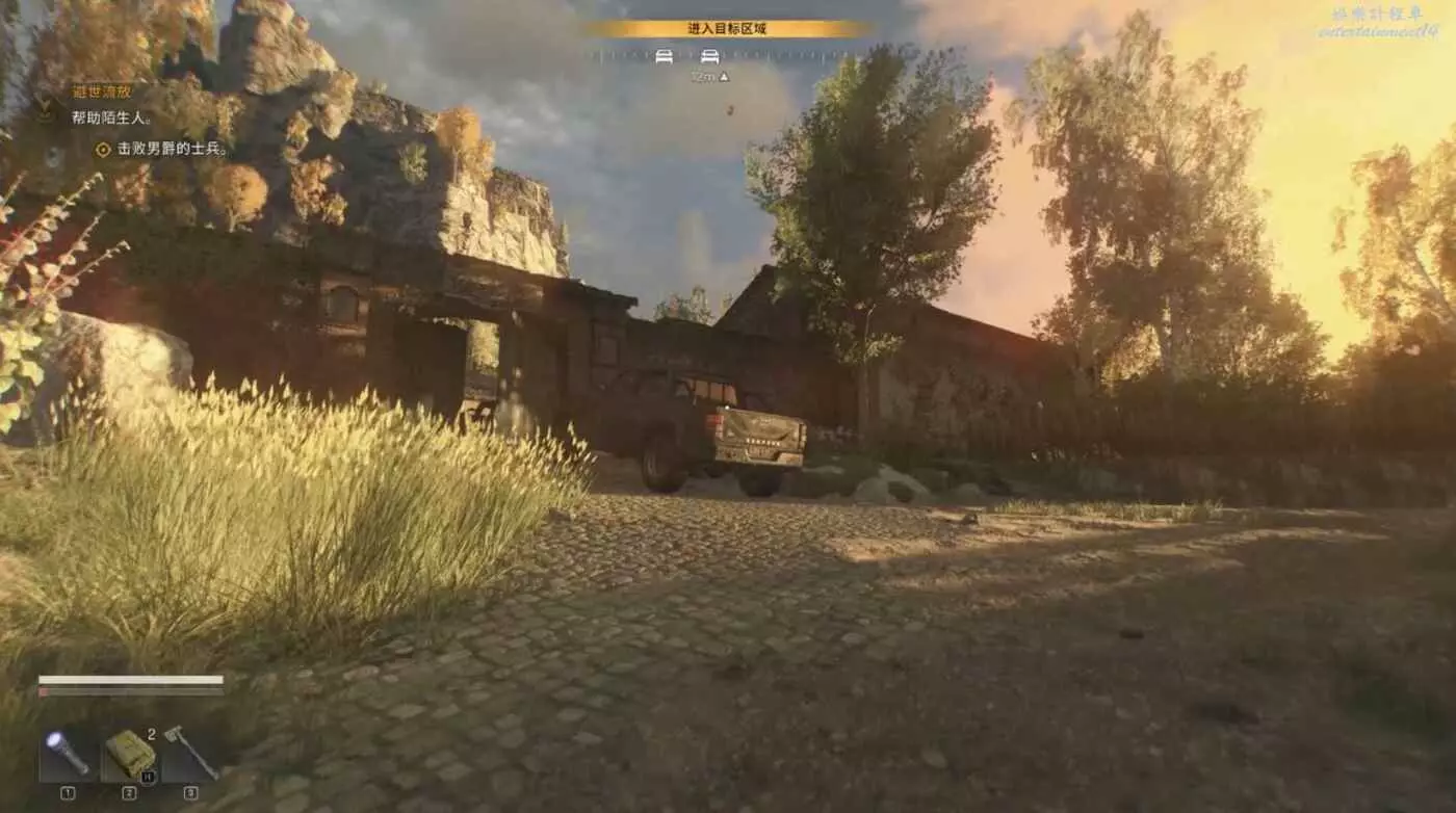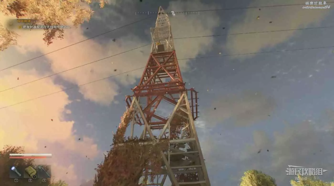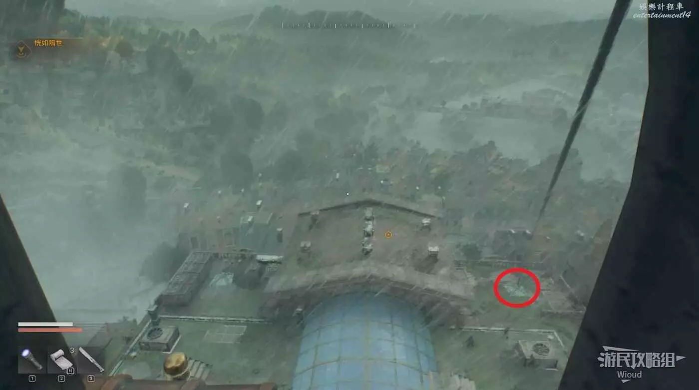 到達位置,可以清楚的看到附近有一座高塔,這個高塔是安全屋之一,它的下面有一個寶箱可打開。