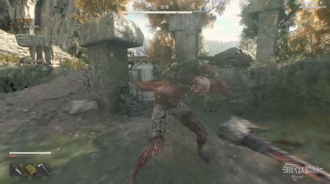 打這種BOSS或被BOSS攻擊都會大幅增加野性進度條,先繞背用NPC給的刀打。