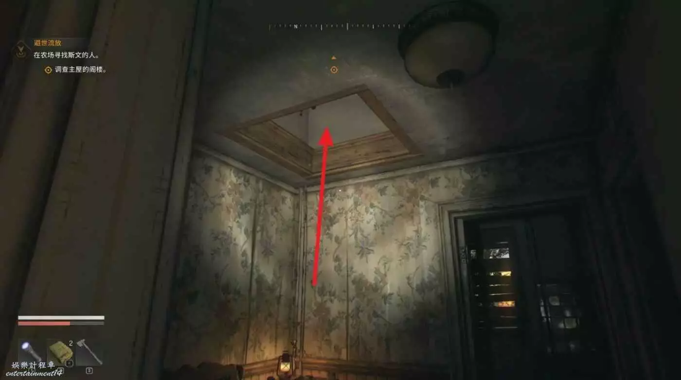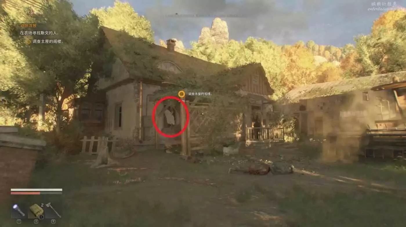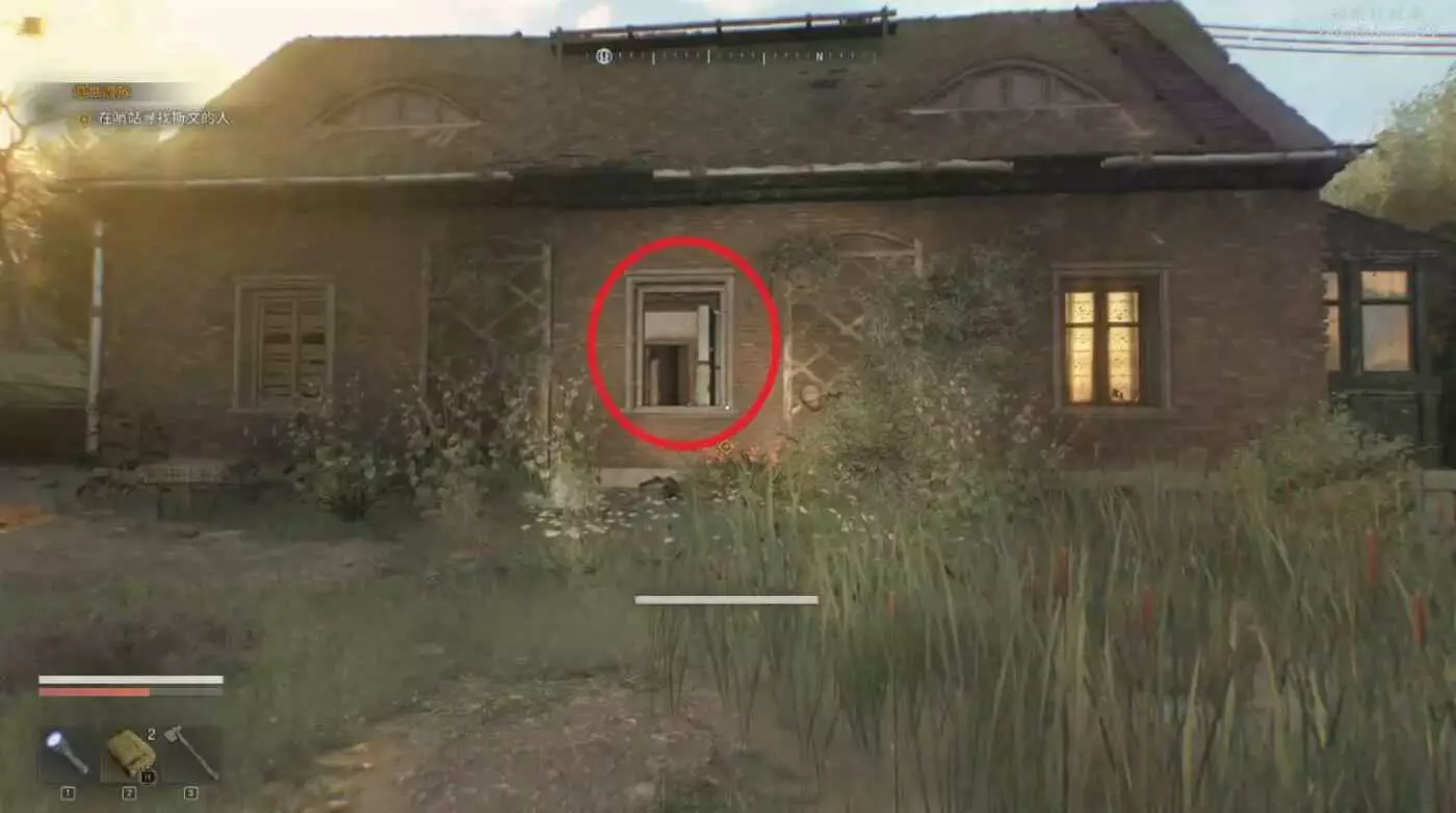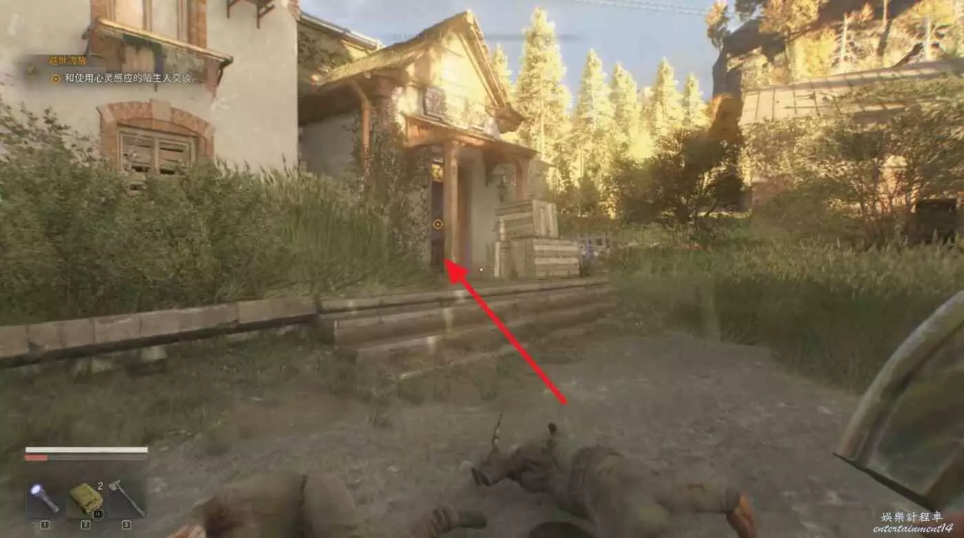 房屋正門右邊爬柵欄進入直接開門,和裡面的NPC對話得知下一個目標。