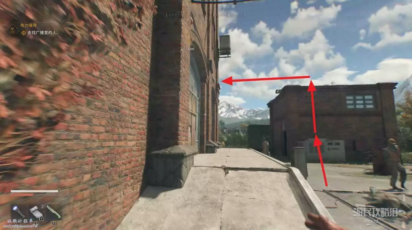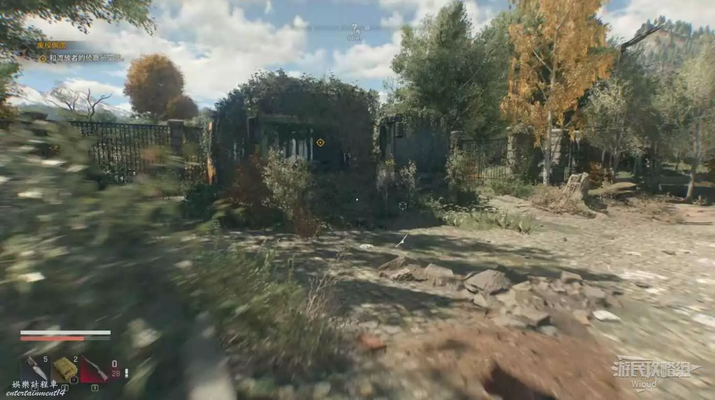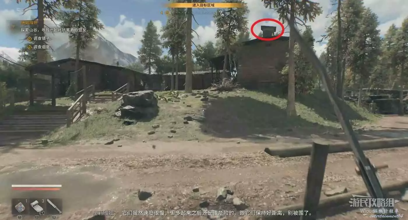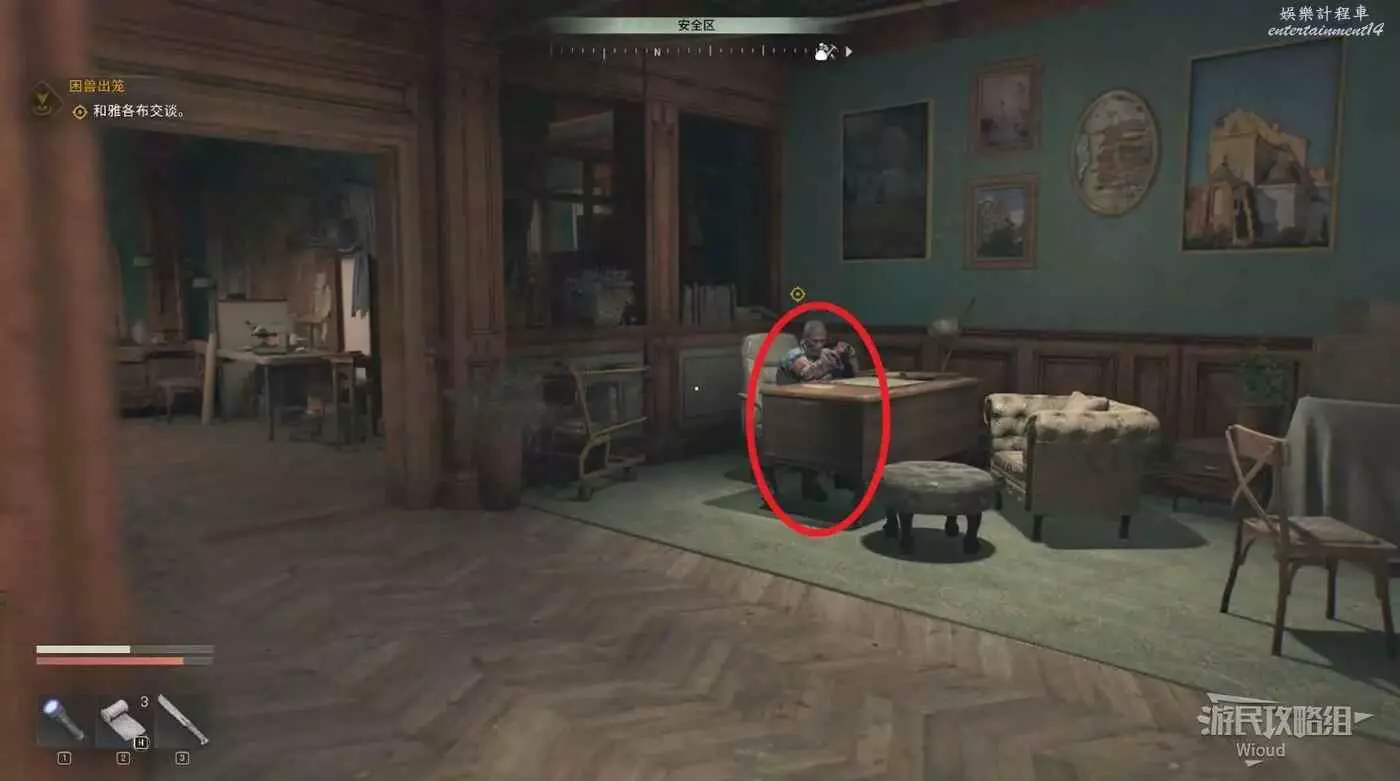 房屋正門右邊爬柵欄進入直接開門,和裡面的NPC對話得知下一個目標。