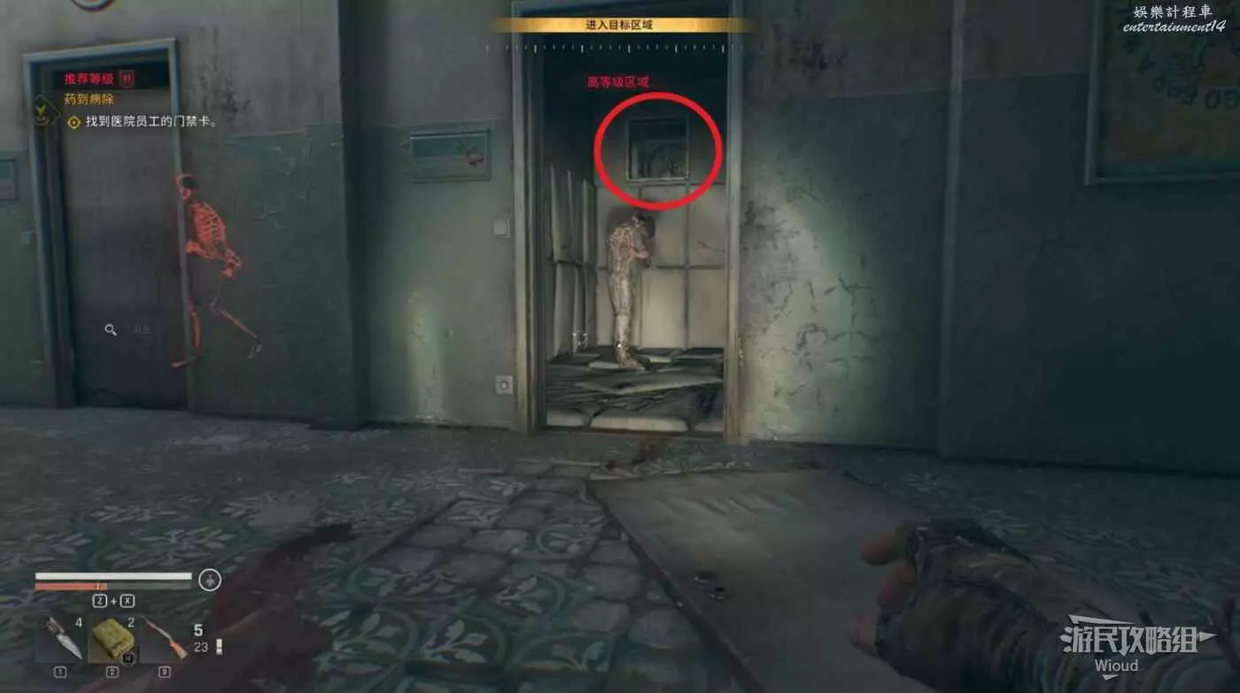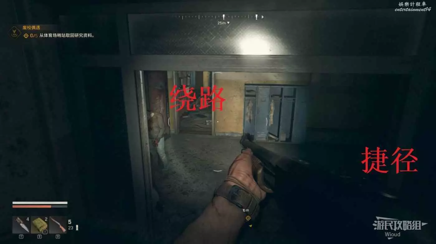 啟動“生存者感知”,潛行狀態下只需要注意有紅色高光的敵人,移動到被木板蓋住的門那裡離開。