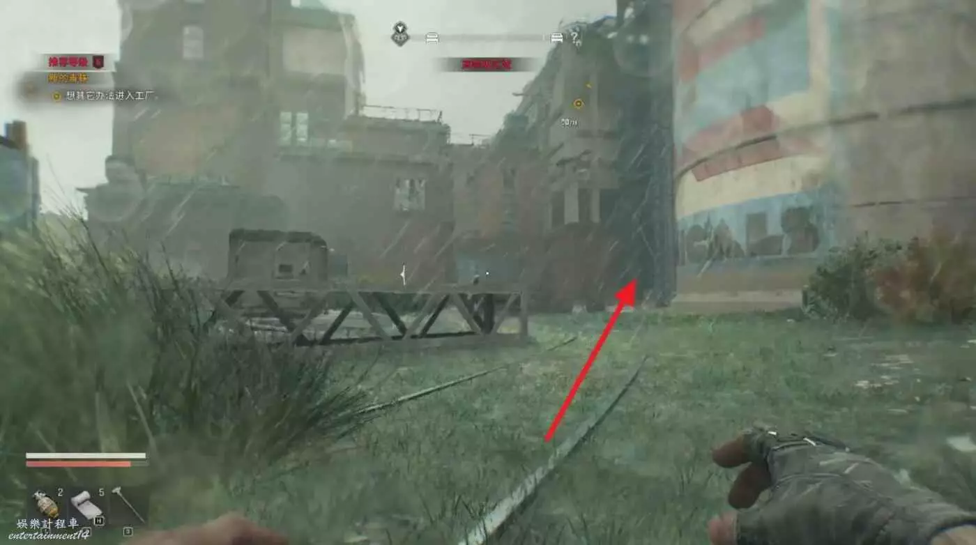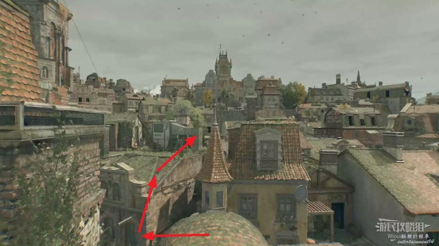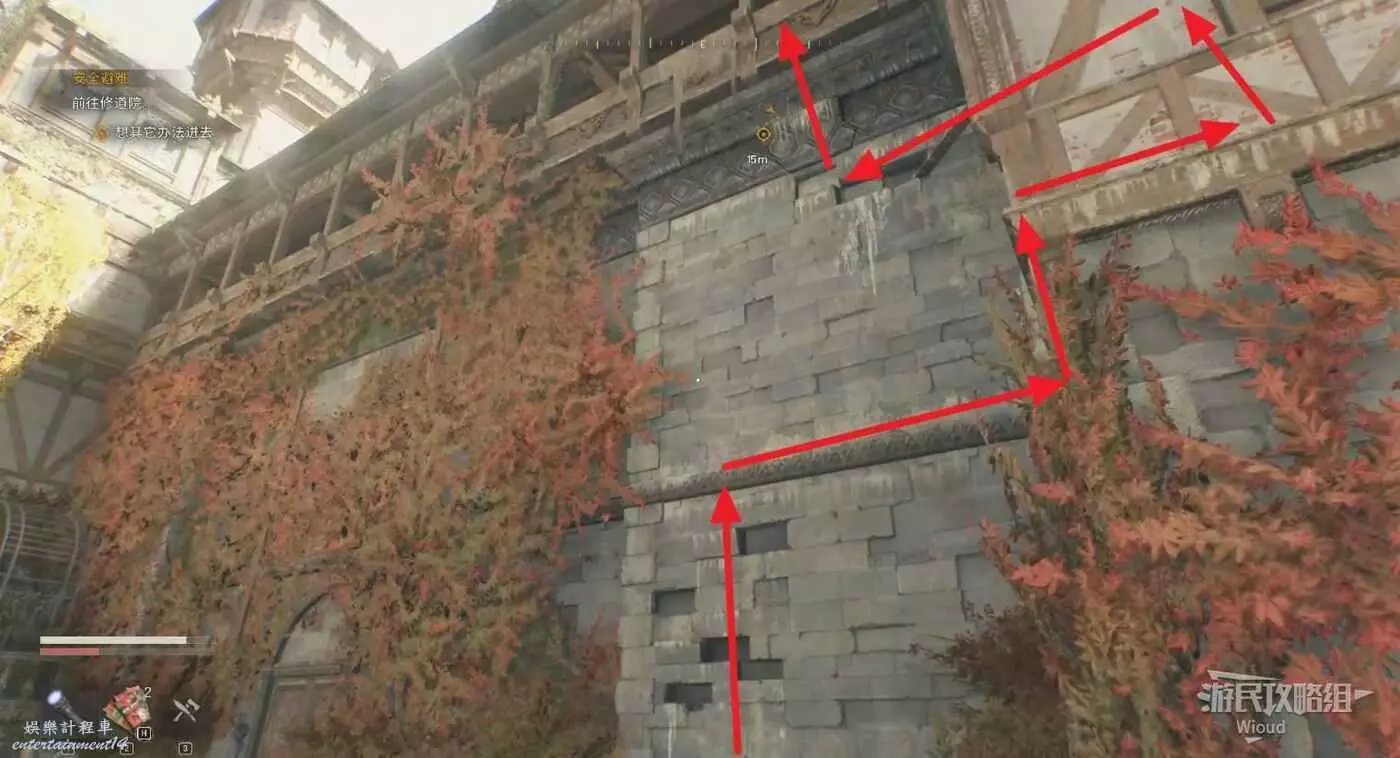 走到目標建築附近,沿著下圖路線逐級繞到高處標記位置,直接進去即可。