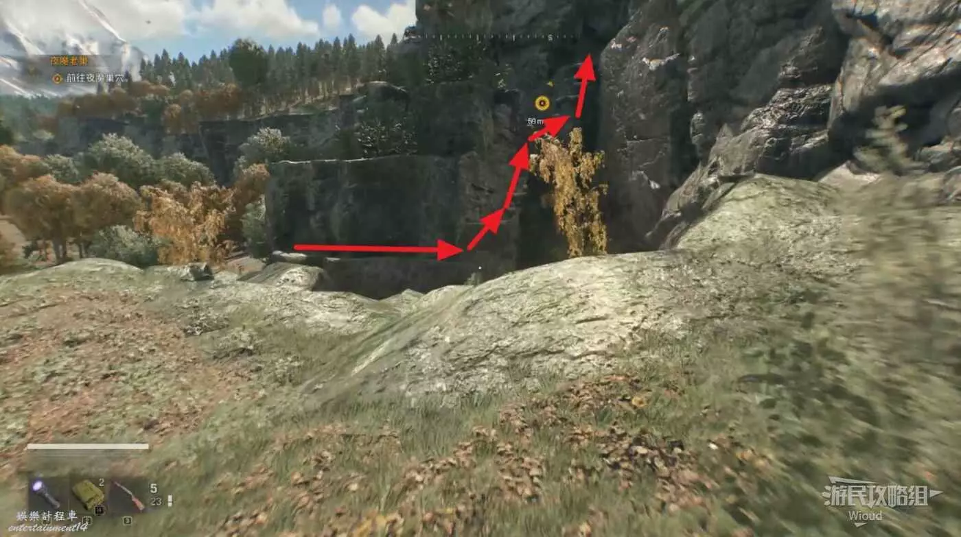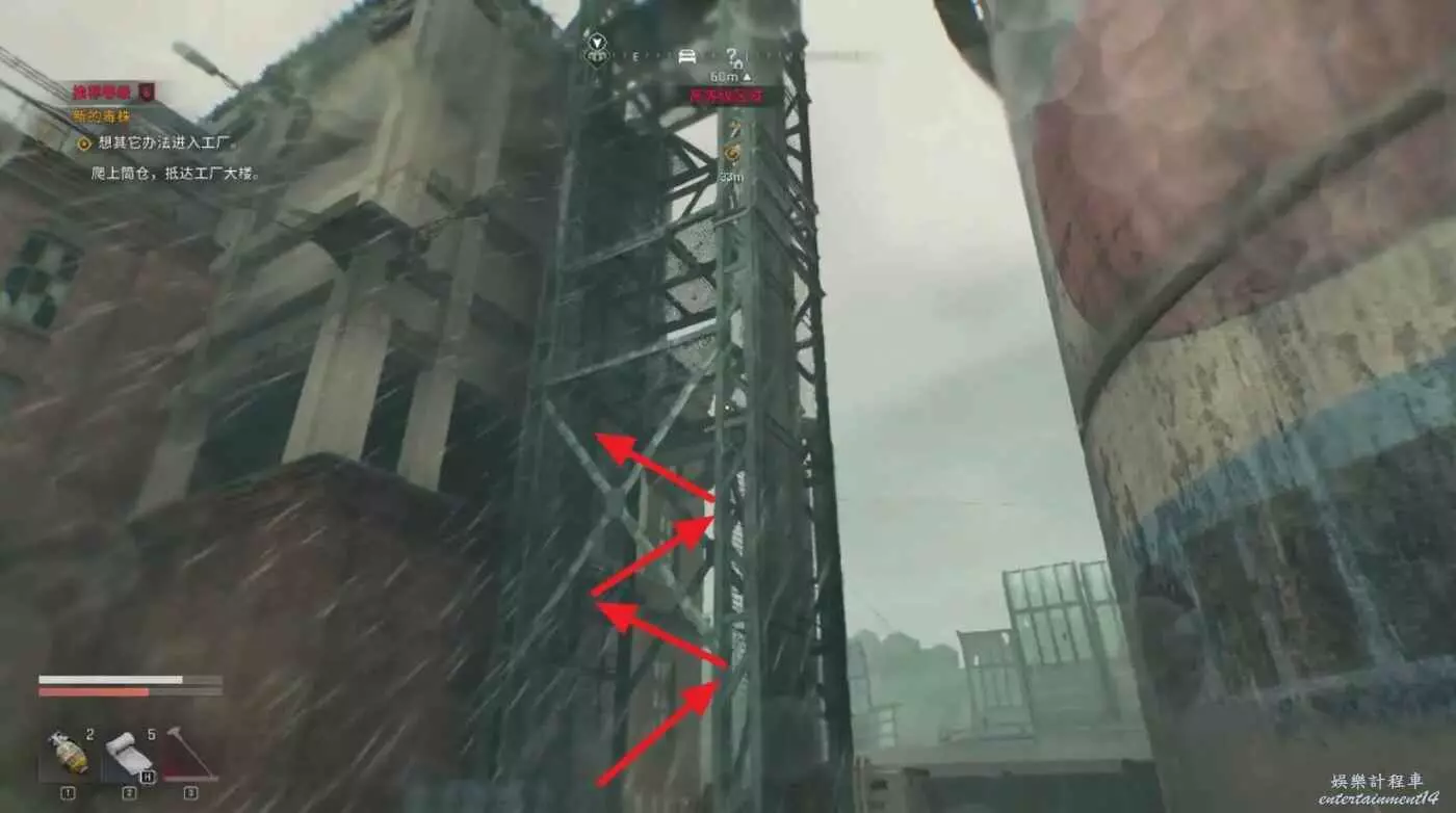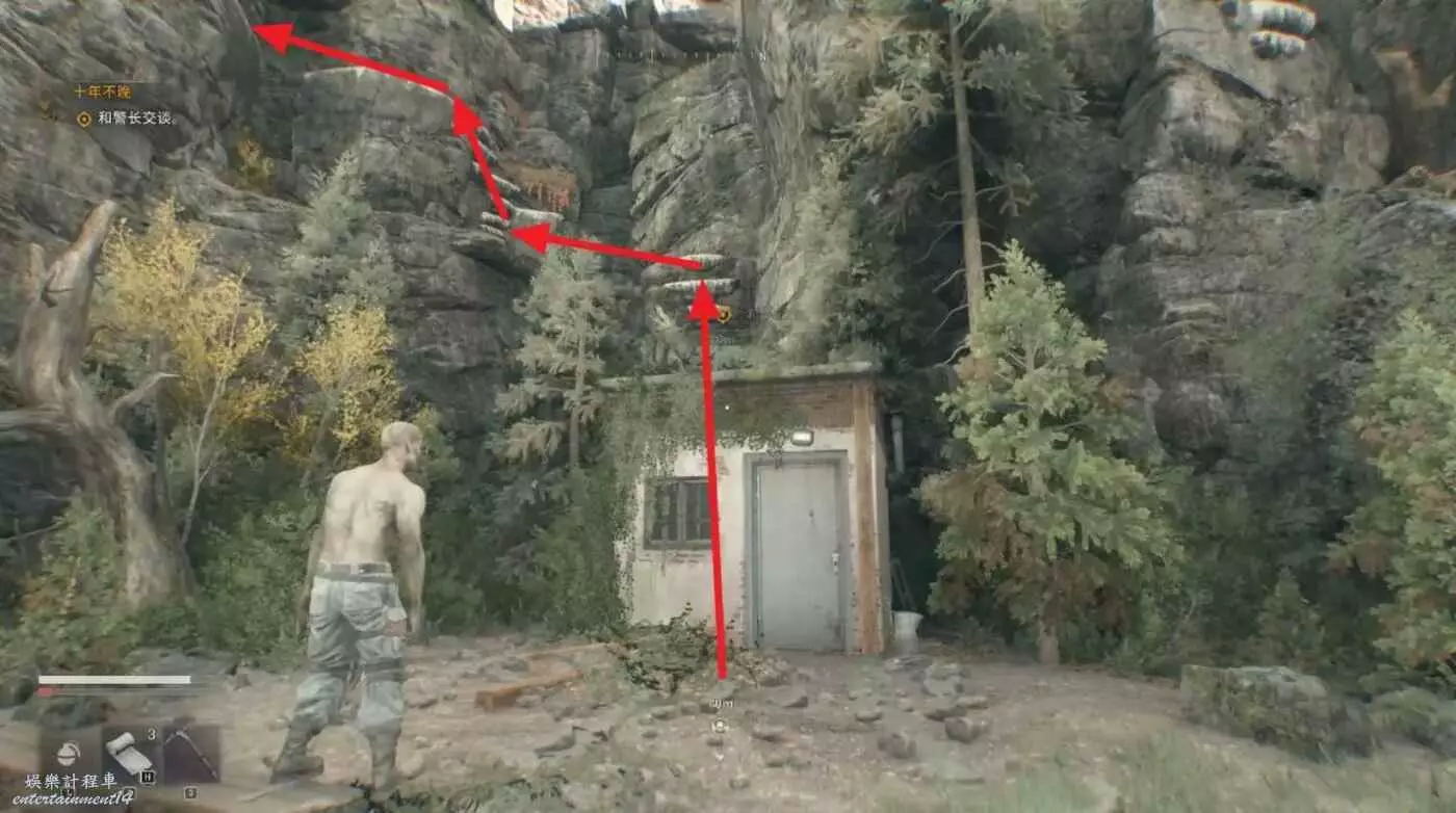 走到目標建築附近,沿著下圖路線逐級繞到高處標記位置,直接進去即可。