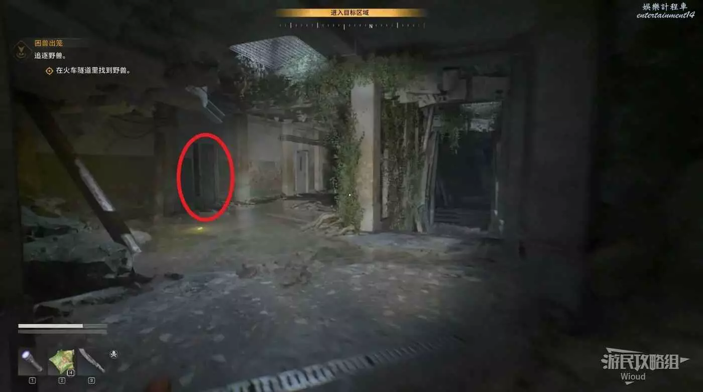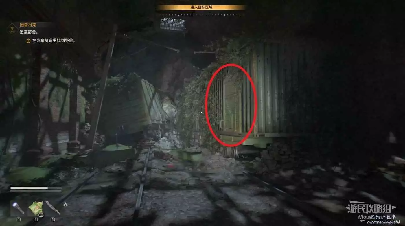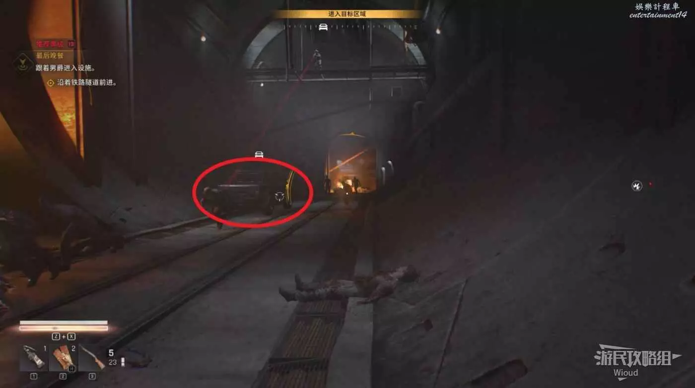 走到目的地火車隧道入口,進去沿路走到一個開闊區域,注意入口左側有一個埋伏玩家的喪屍。