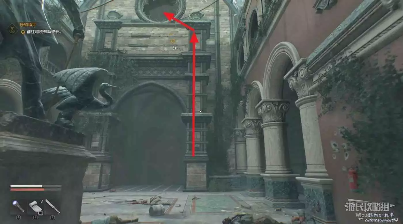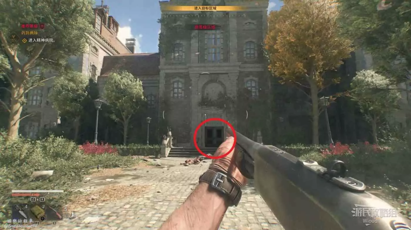 先去標記點和莉蒂亞對話,然後前往精神病院的位置,直接從正門進去。