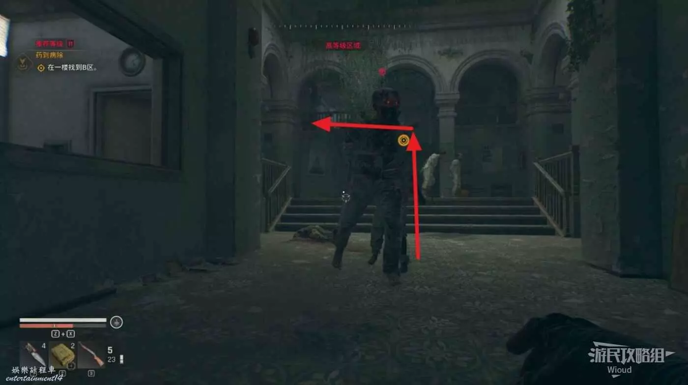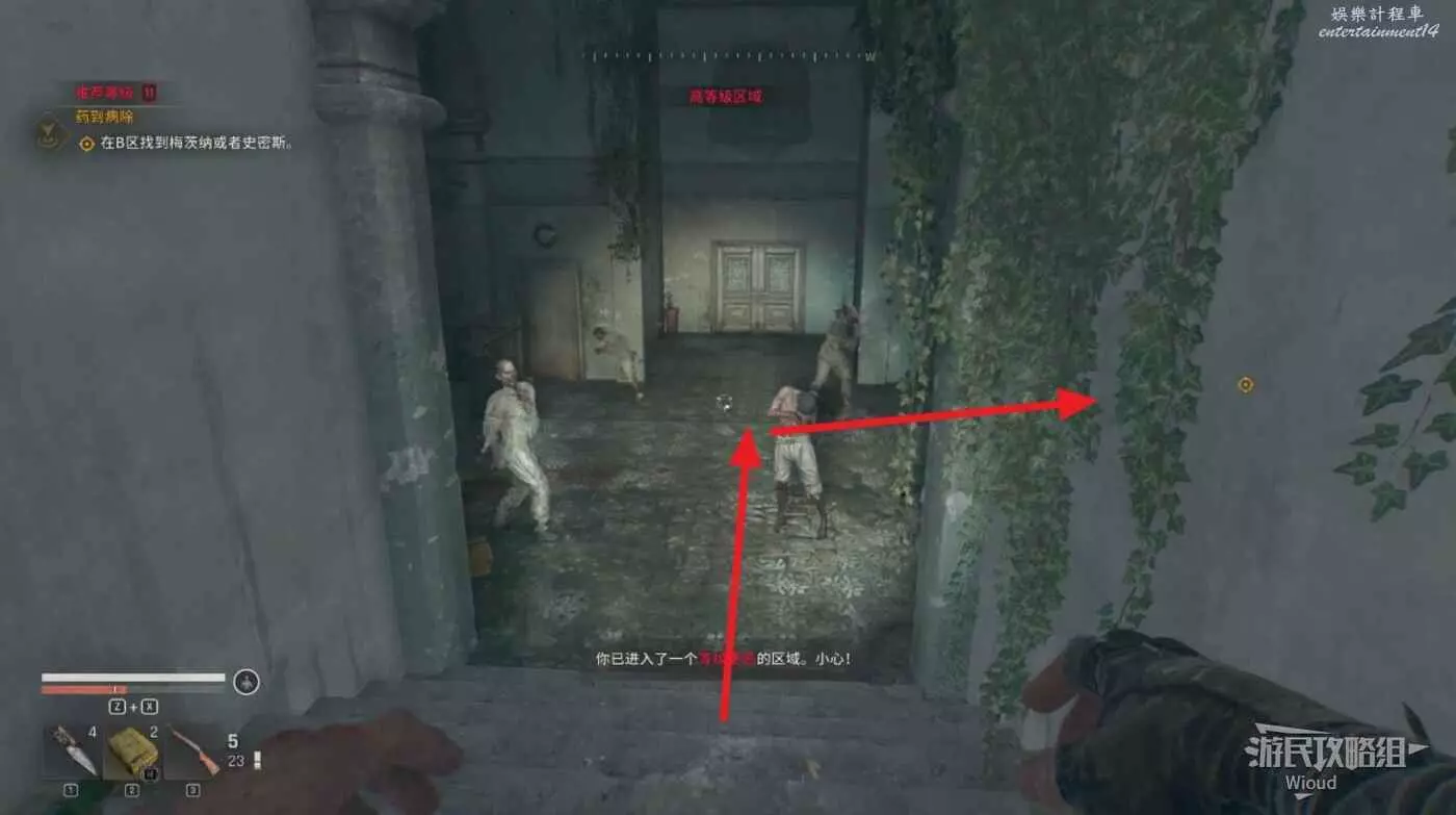 穿過另一扇門爬樓梯上去,把路途遇到的喪屍全幹掉。