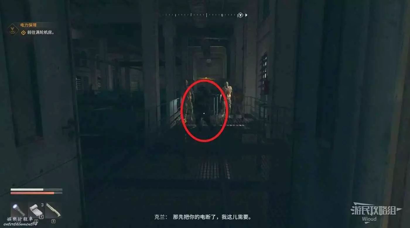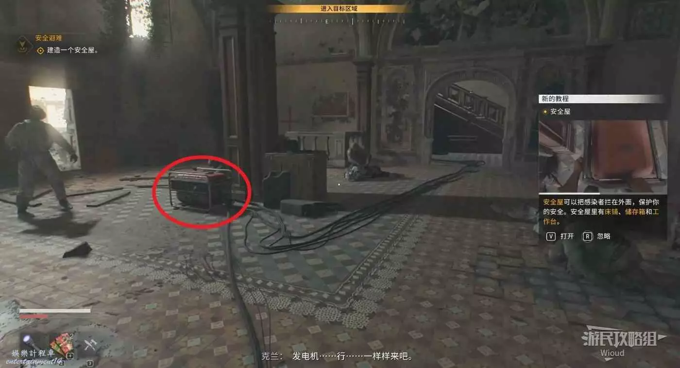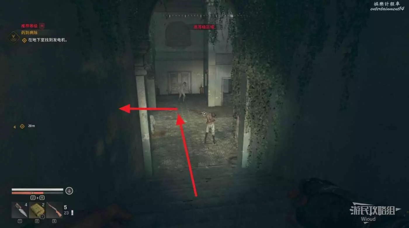 從門縫出去直接和發電機互動,等周圍喪屍都醒來時,左邊有陽光的門出去,然後跳到左側或者右側的高處。