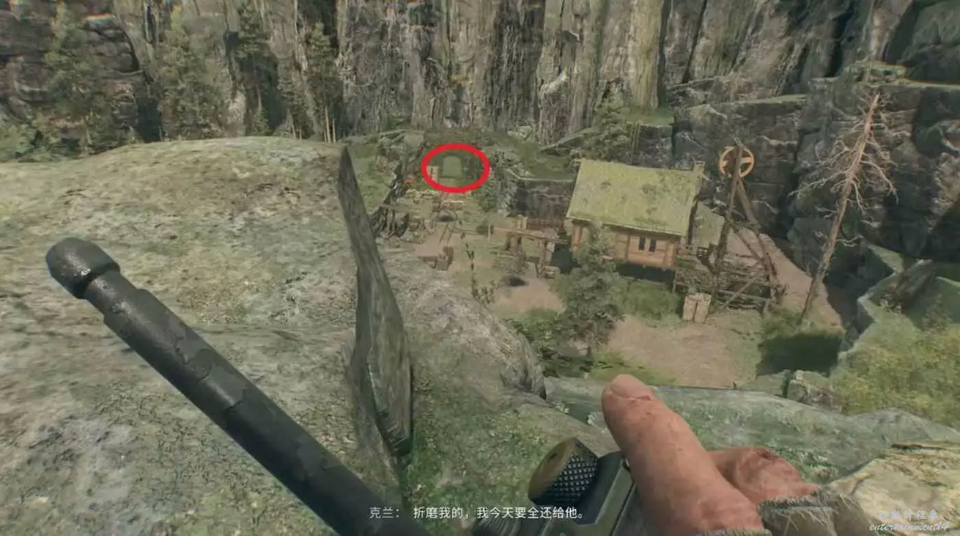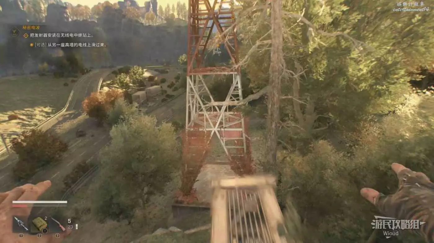 通過跳到旁邊高臺,對準中繼站的方向扒一個樹枝借力跳上去,爬到高處對準目標中繼站用繩索滑到鐵絲網內。