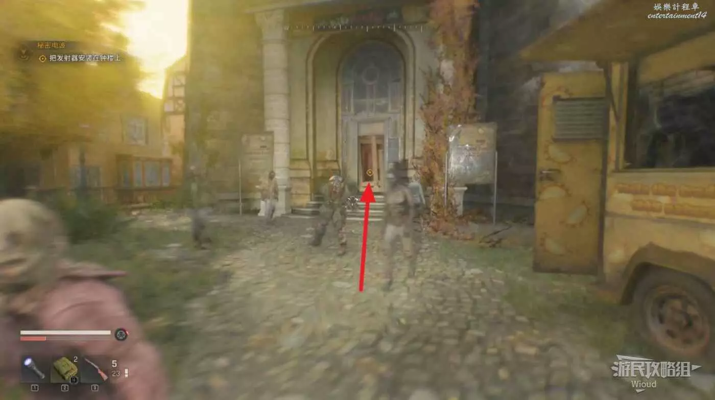 修道院門前,用誘餌把喪屍引走,先和門互動觸發下一個節點。