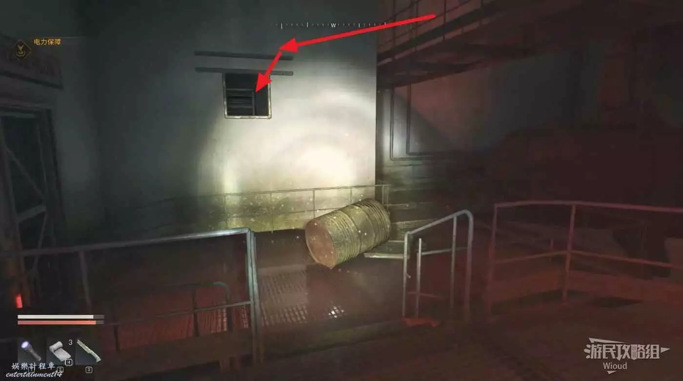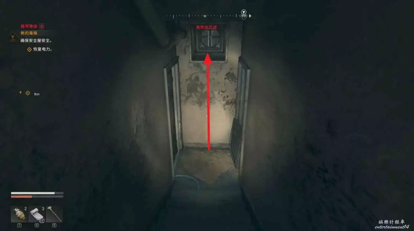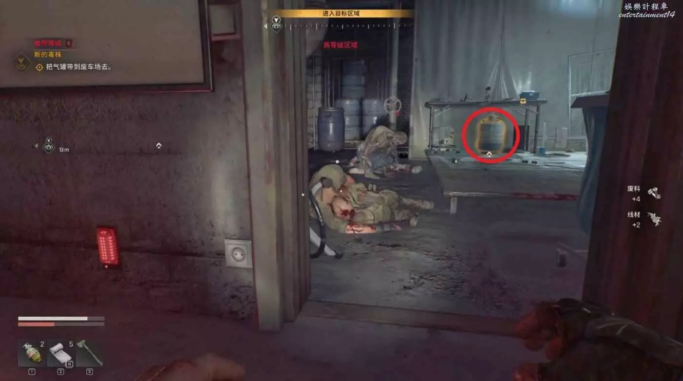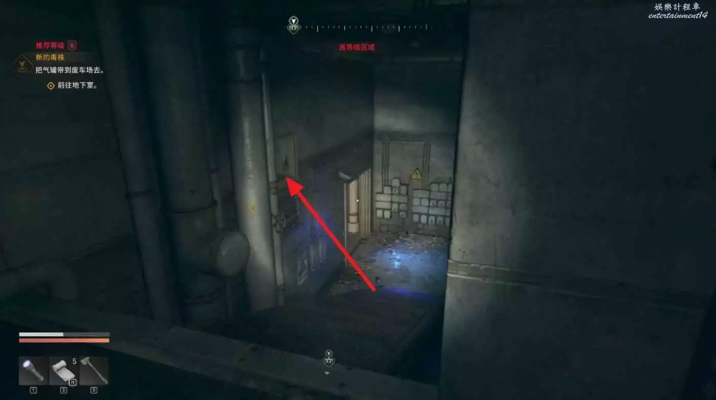 沿著路徑移動到底層,我們需要進入底層區域拿到兩個瓦斯罐,底層入口有紫外燈。