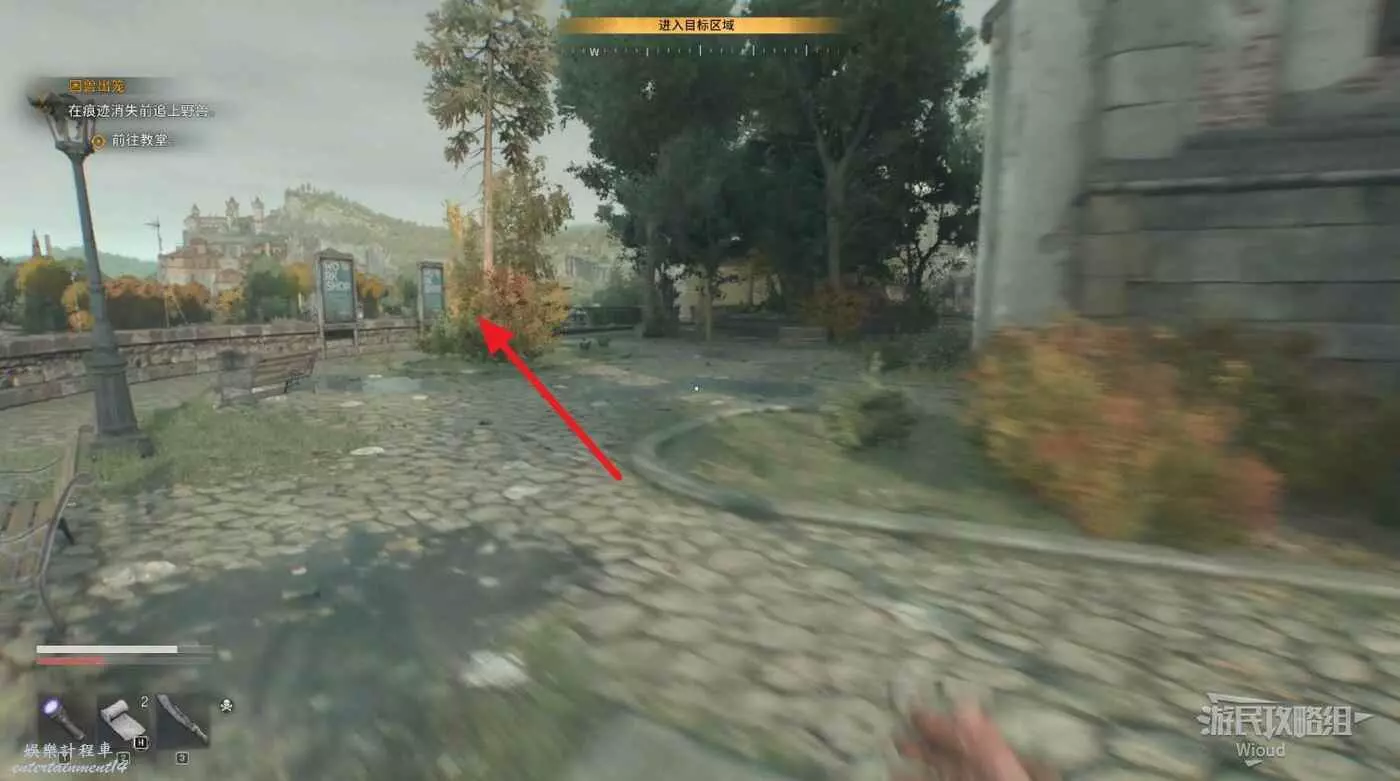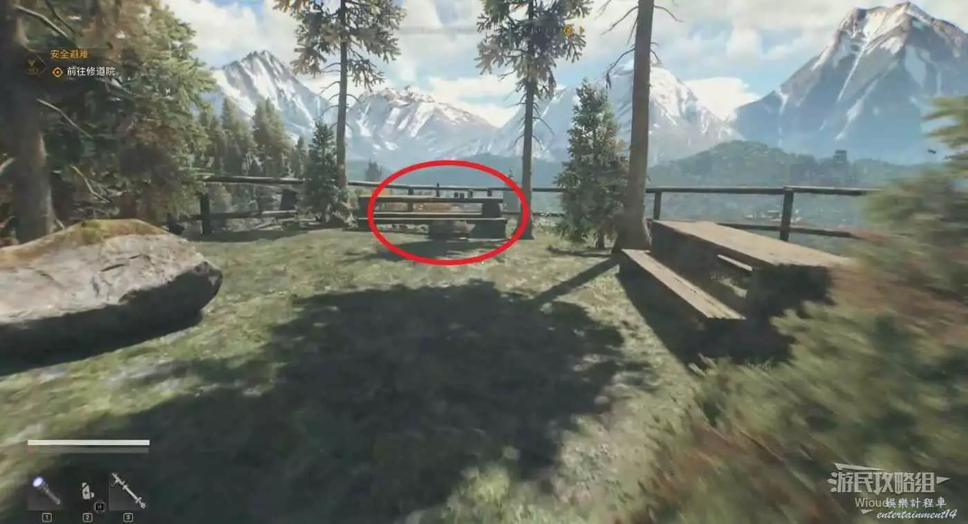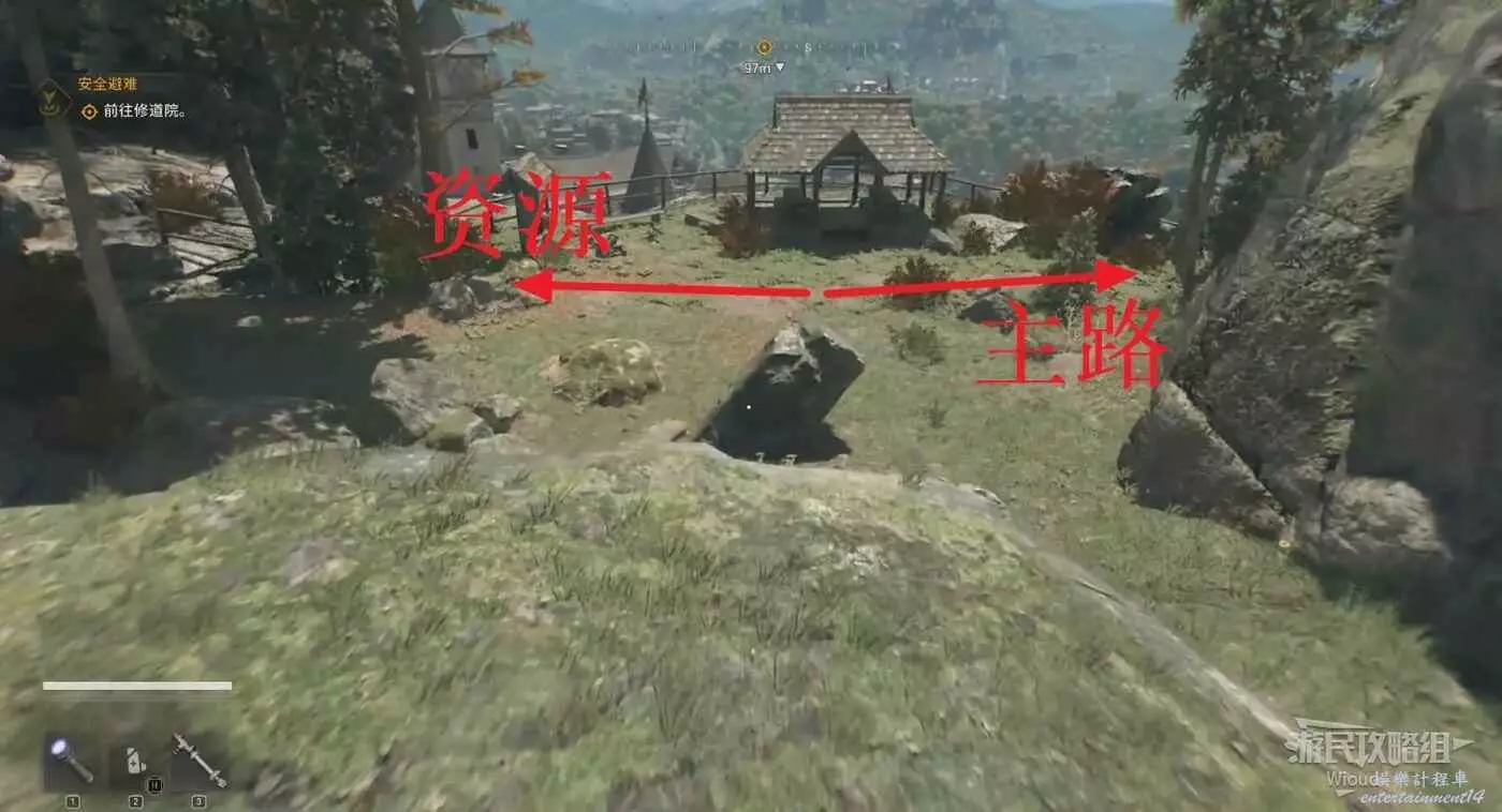 不遠處屍體前可以搜刮背包,左邊涼亭可以撿到誘餌道具。