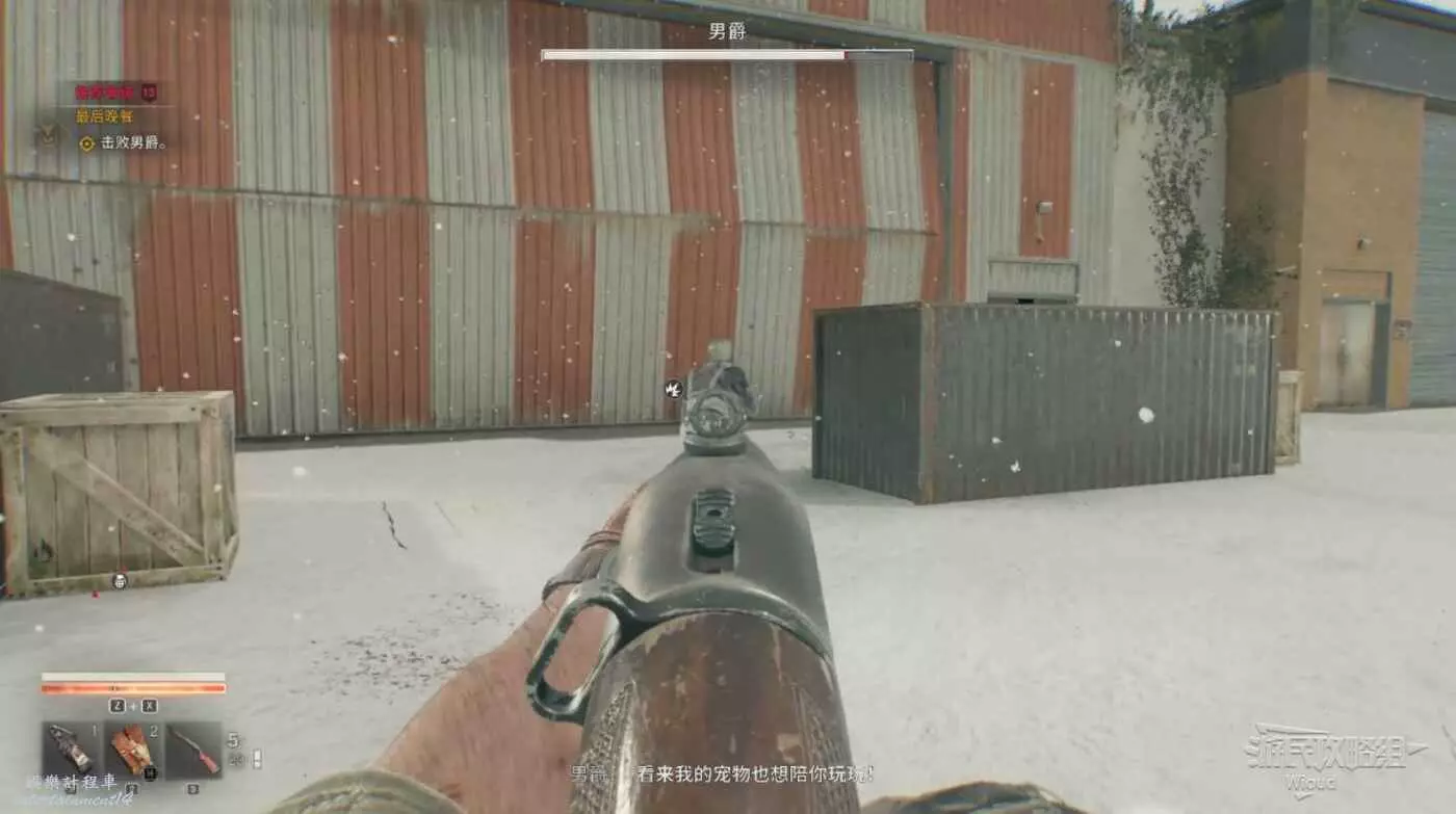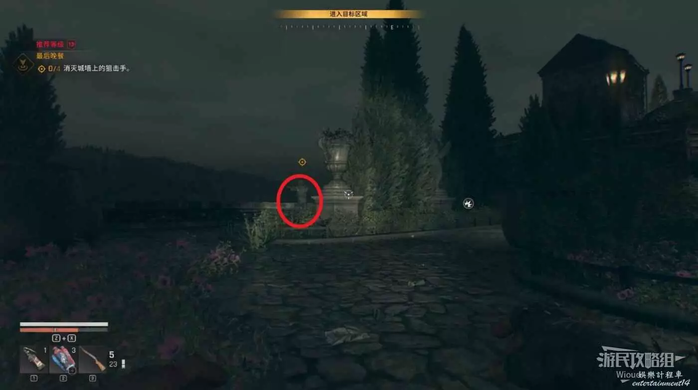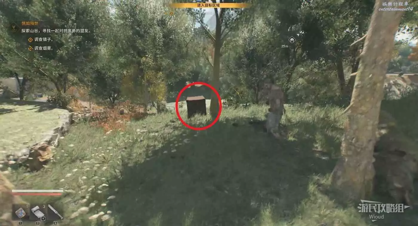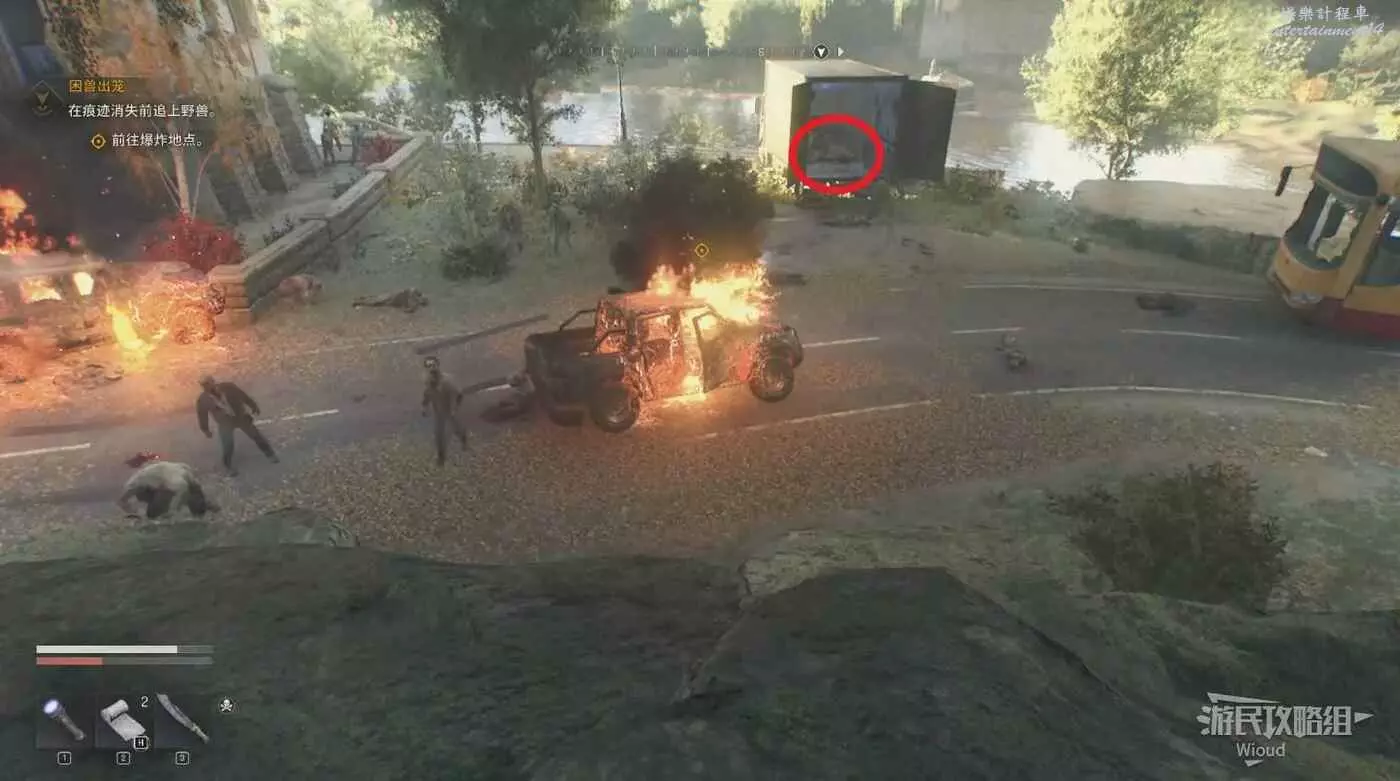 不遠處屍體前可以搜刮背包,左邊涼亭可以撿到誘餌道具。