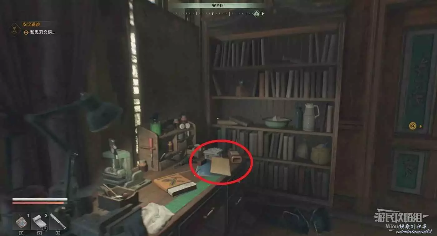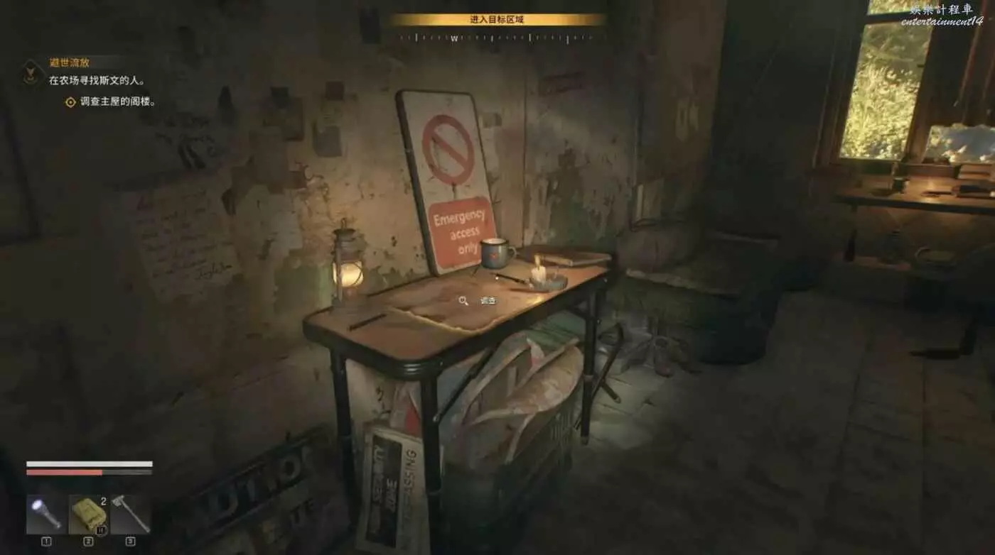 沿路走,直到看見一個不大的休息屋,這裡往左走,可以在盡頭的桌子上拿到不少物資。