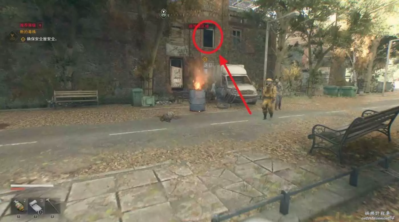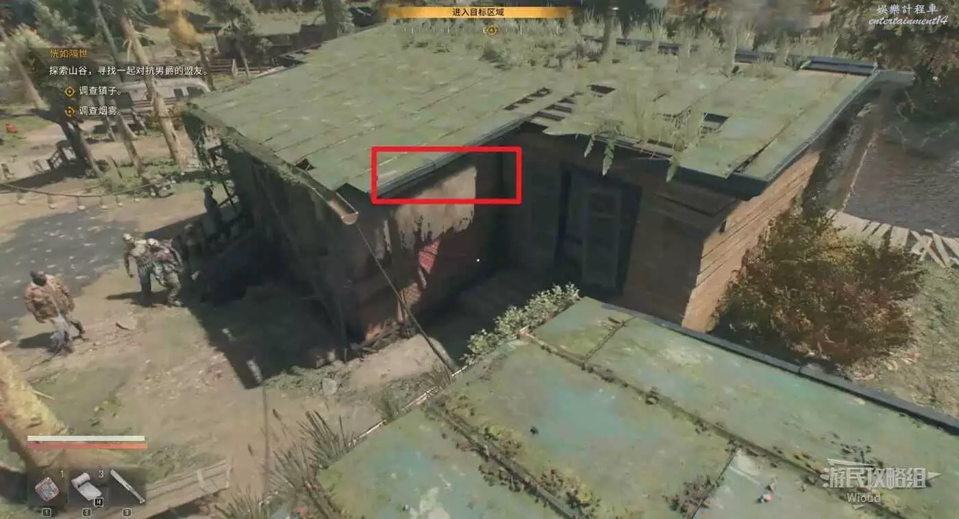屋頂跳到院子,進入指引處的安全屋。