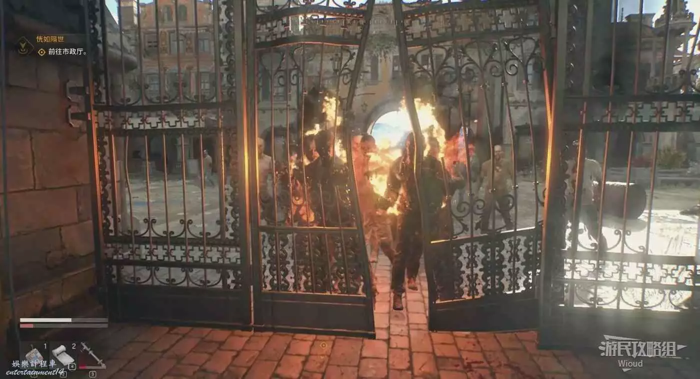 市政廳門口剛來的時候有一個著火的桶,可以引誘喪屍靠近這裡然後再從兩側爬到市政廳門口。