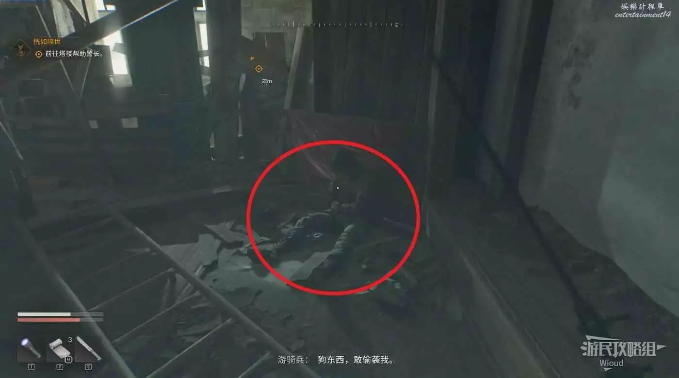 爬一段樓梯遇到一個坐在地上的NPC,與其對話可獲得子彈。