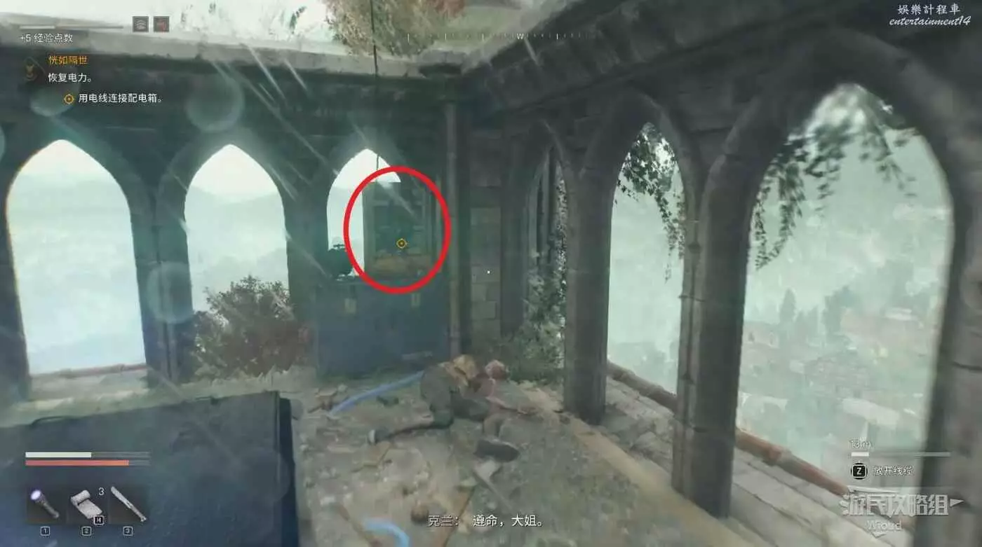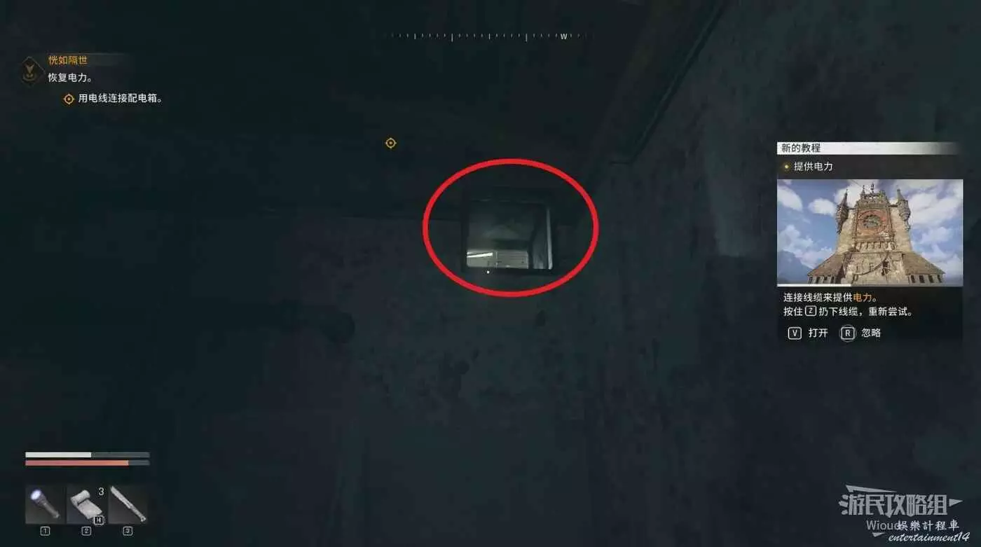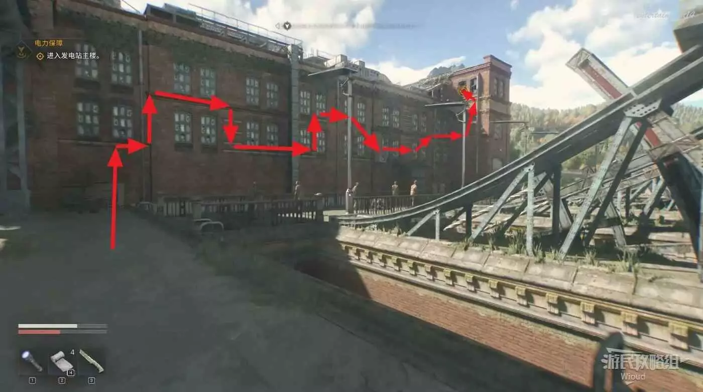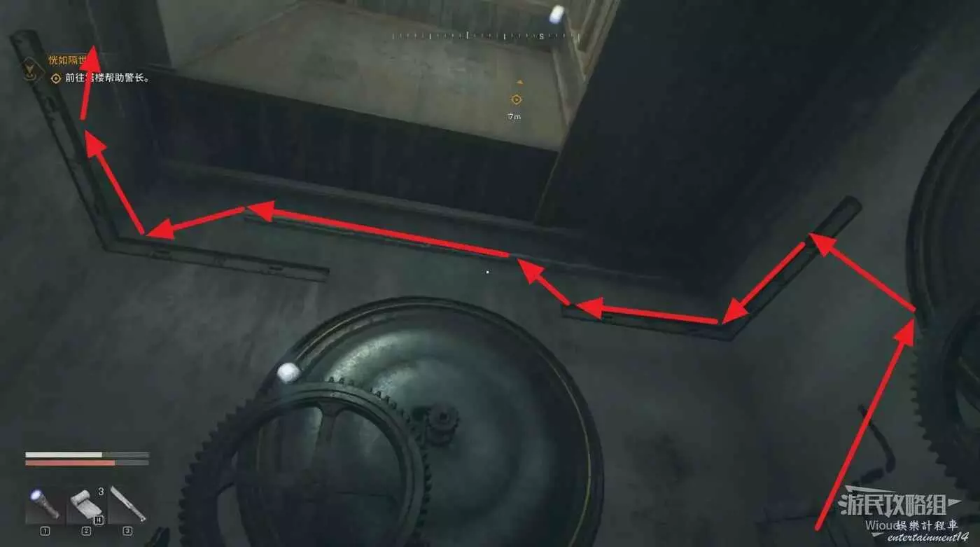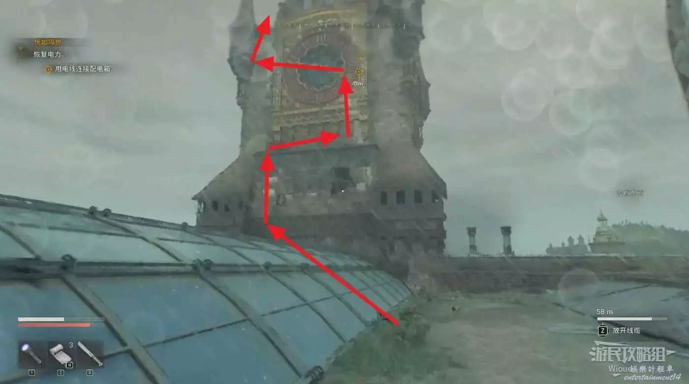 沿著下圖路線移動到鐘塔最高處,把電線插到對應的機器裡觸發劇情,完成這個主線任務。