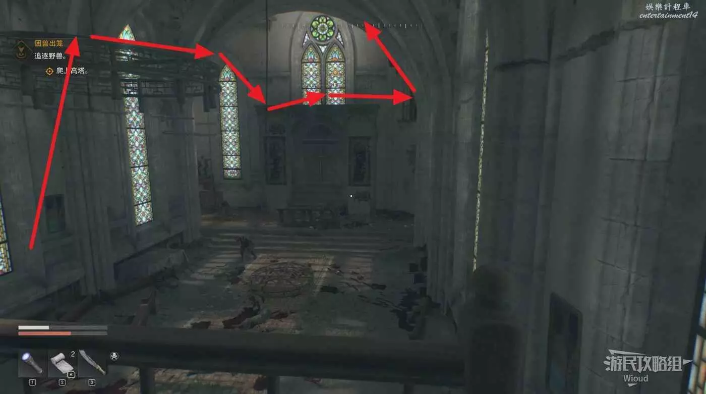 後面需要沿著牆壁上的凹槽爬到頂端,沿著下圖路線移動即可。