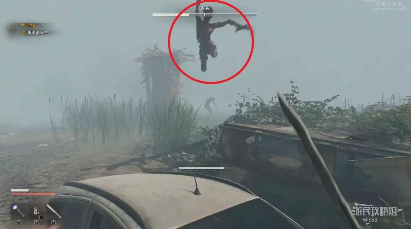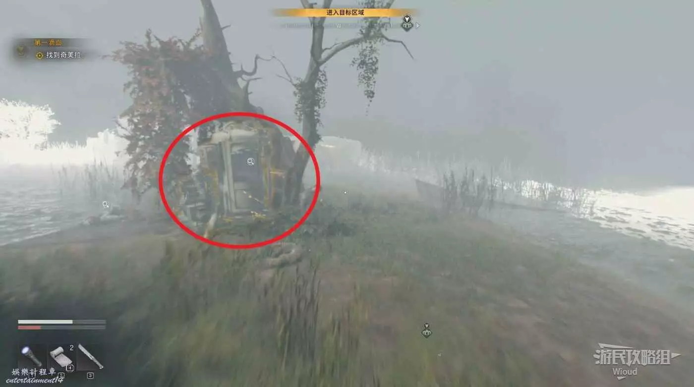 先和此處的容器互動,拾取右側屍體旁的磁帶再和屍體互動,觸發與奇美拉【迷霧】的戰鬥。