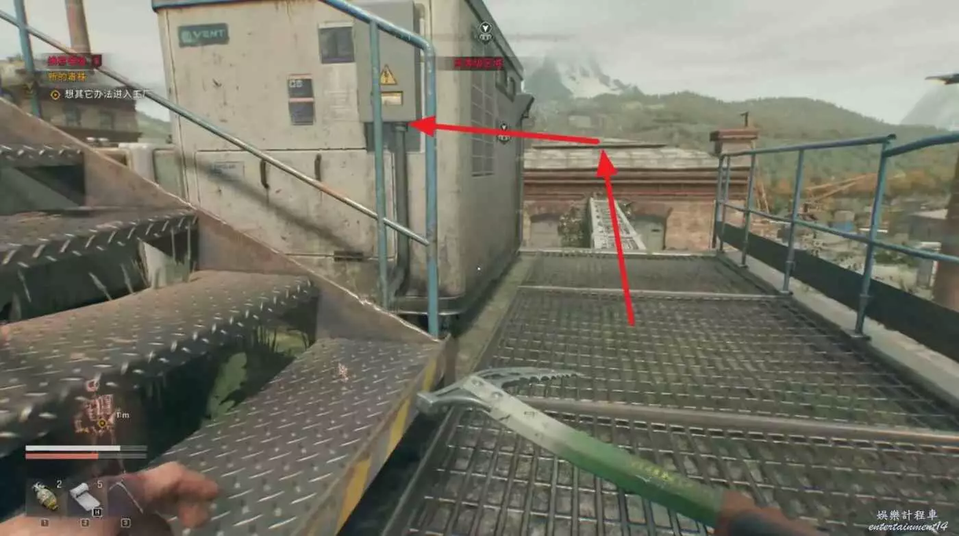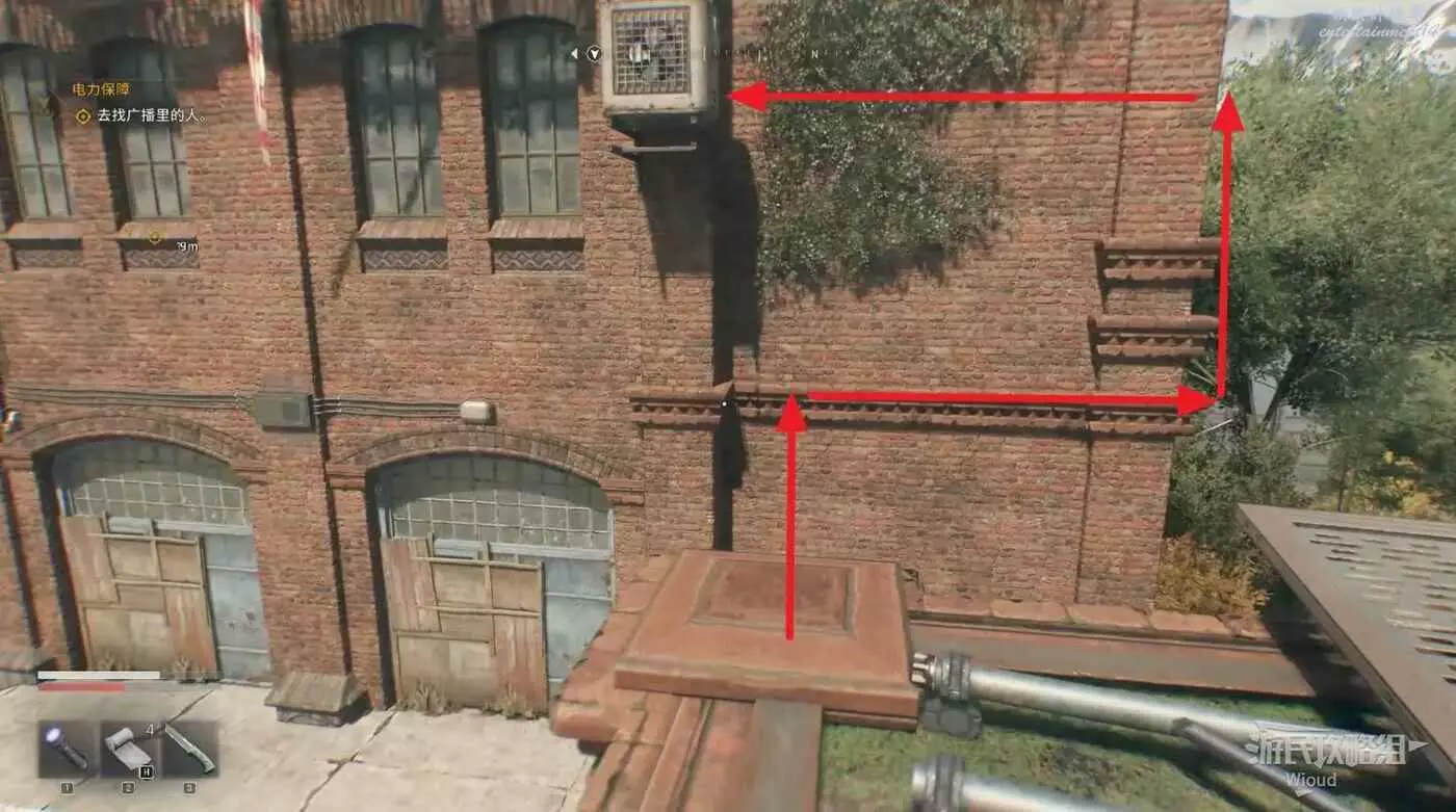 標記的門在高處,面對門通過右側白色裝置跳到房子高處,然後扒住主樓的橫樑。