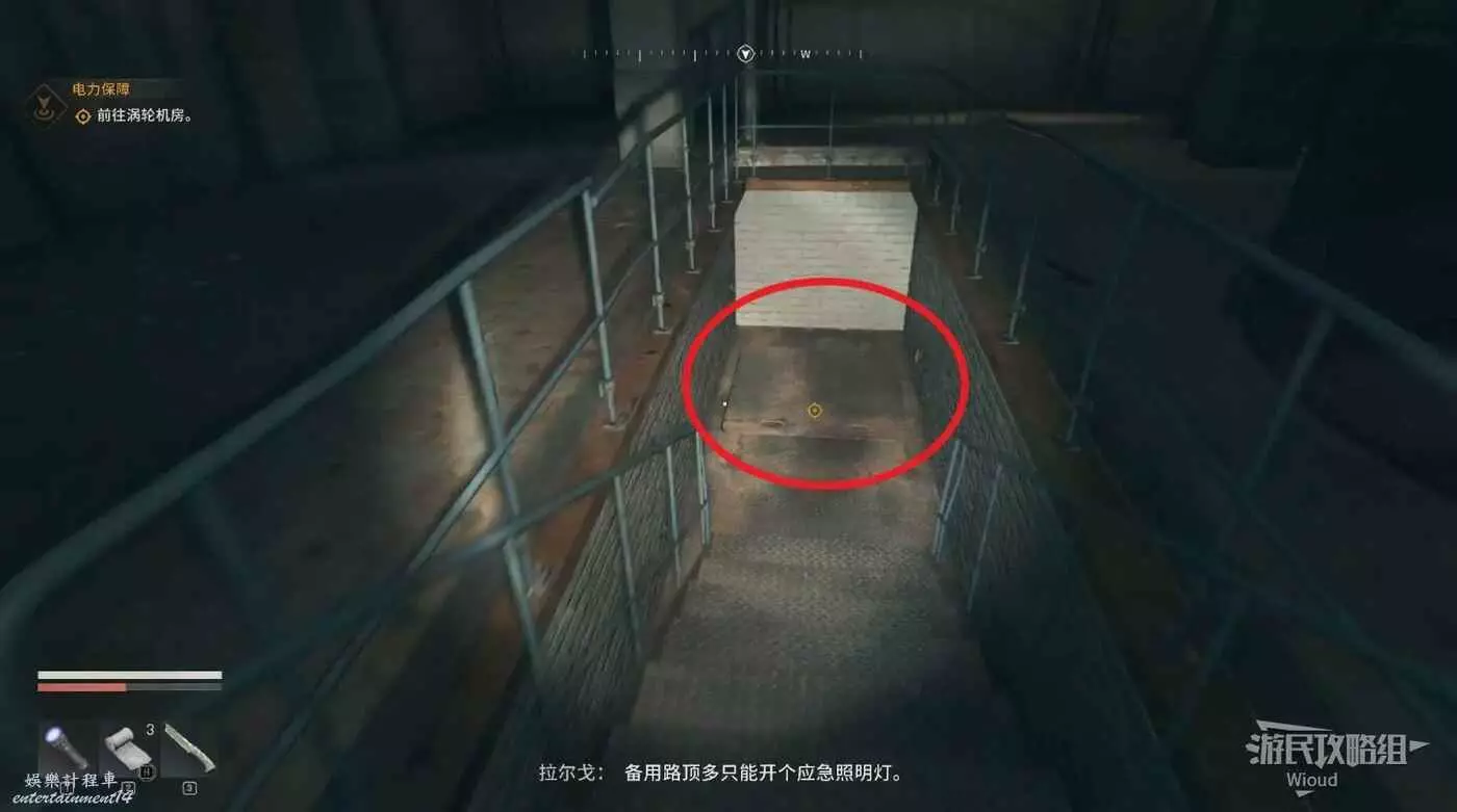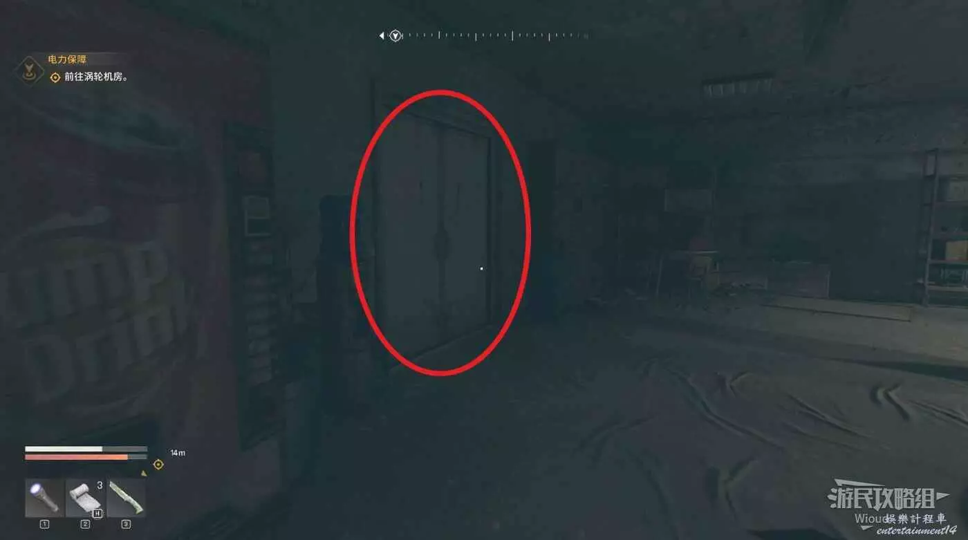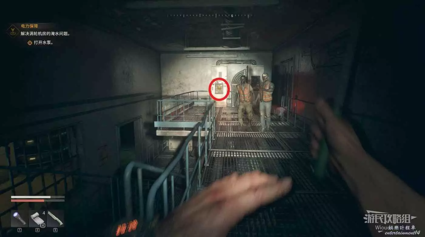 啟動發電機後,注意外面夜魔位置,開門直走進入電梯往上爬。