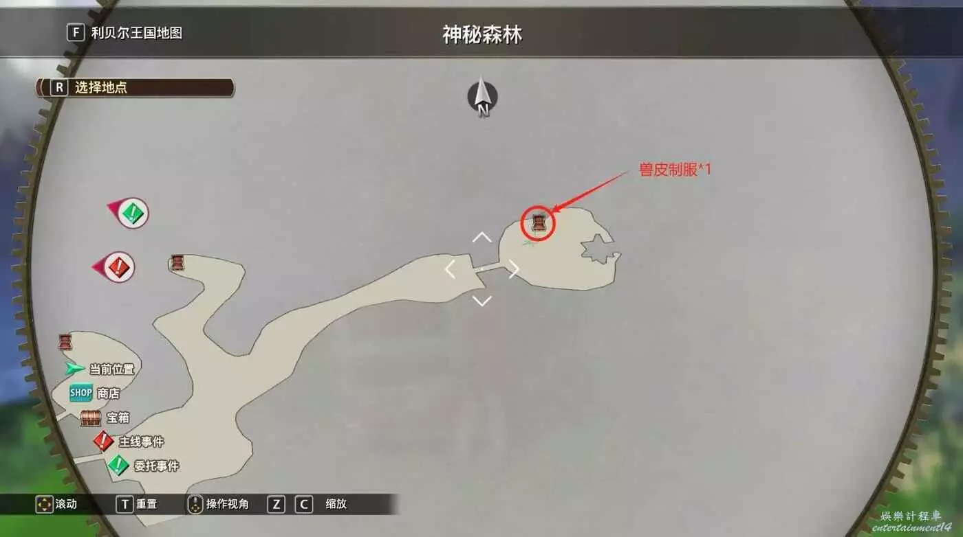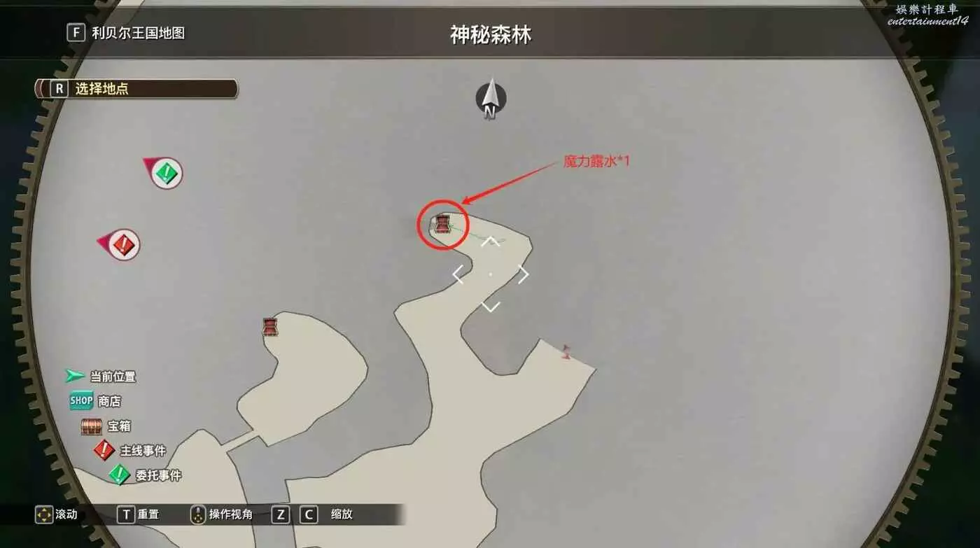 調查格魯納門左邊的寶箱獲得7種屬性的耀晶片各50枚,並以此寶箱為起點,調查北邊的閃光點,獲得耀晶石塊*100,調查東北方的寶箱獲得復活藥*1(實在找不到就看神秘森林入口的東邊),可以在路上弄各種魔獸食材,並在章節結束離開洛連特前保證每種魔獸食材數量不低於10個,可能到柏斯會用到