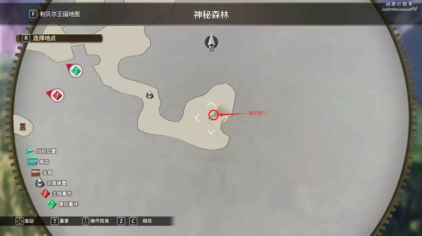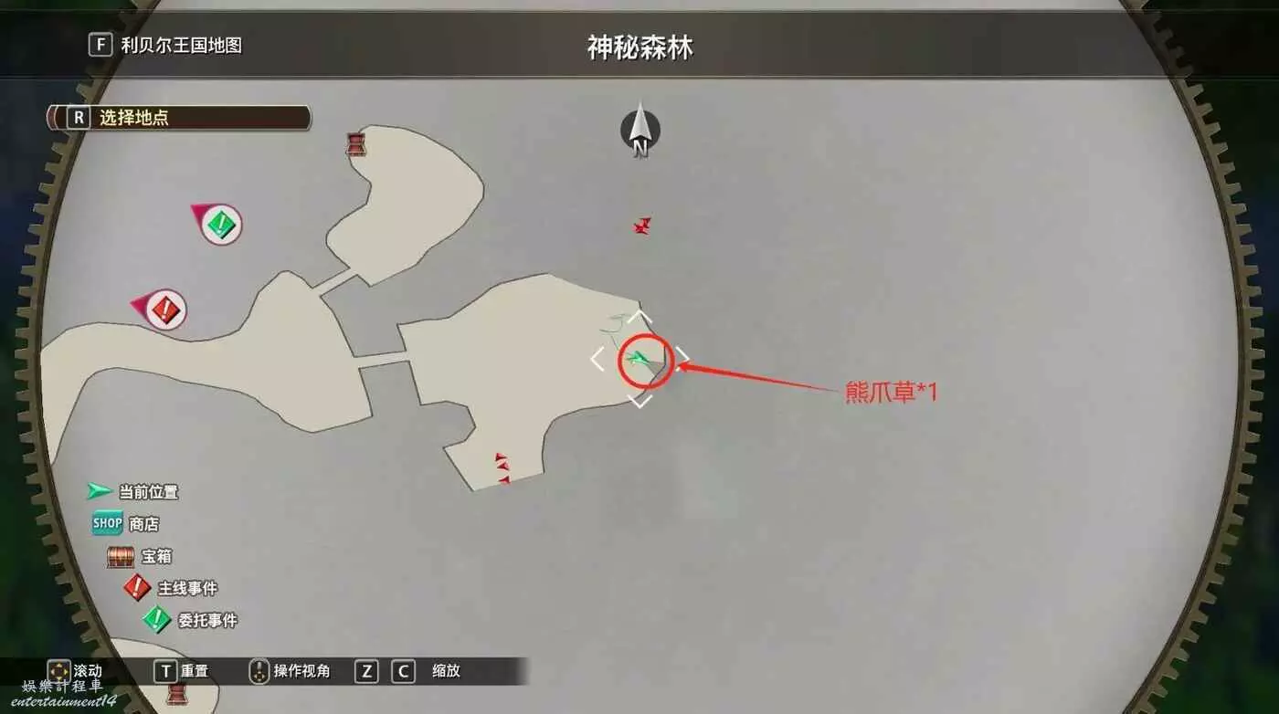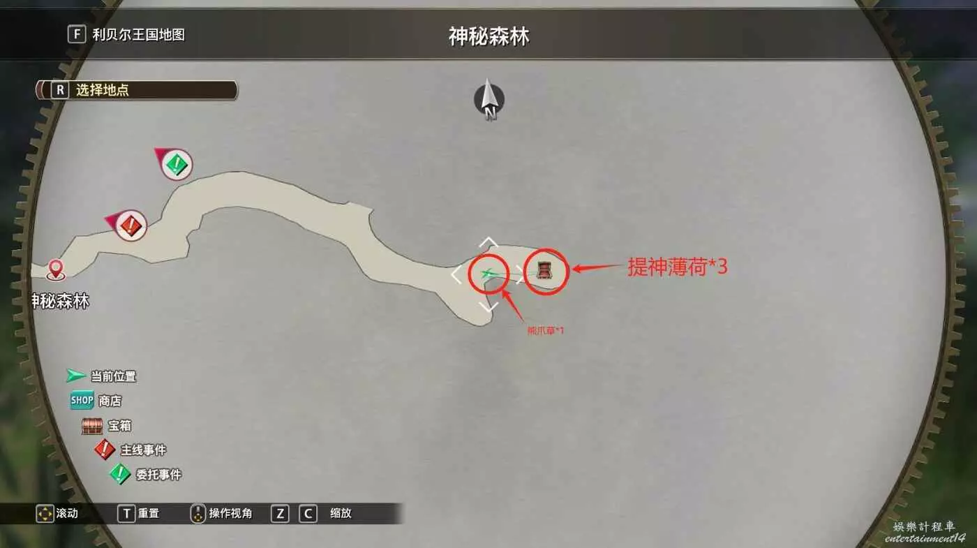 神秘森林第一個小岔路上有一個熊爪草和寶箱,調查寶箱可獲得提神薄荷*3