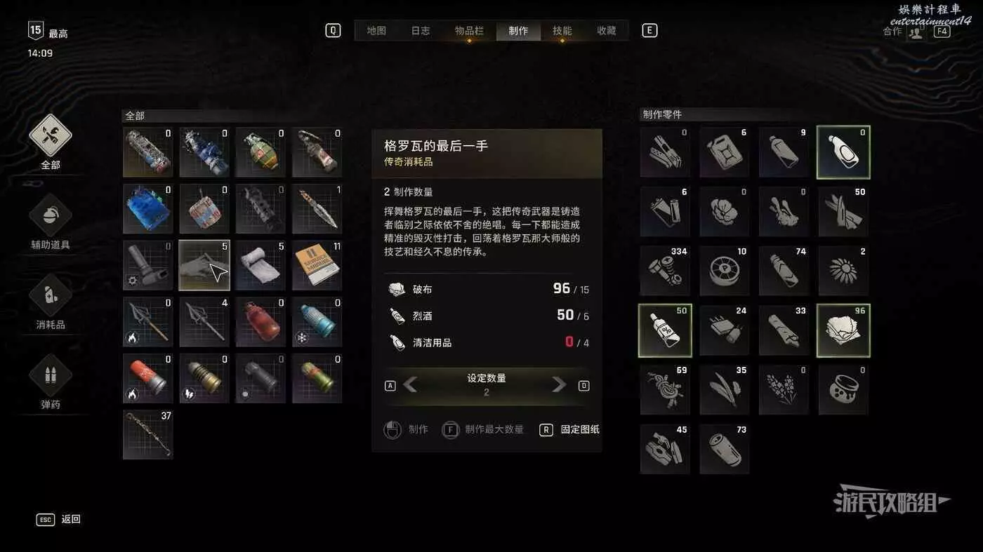 在製作功能表可以消耗破布×15、烈酒×6、清潔用品×4來製作。