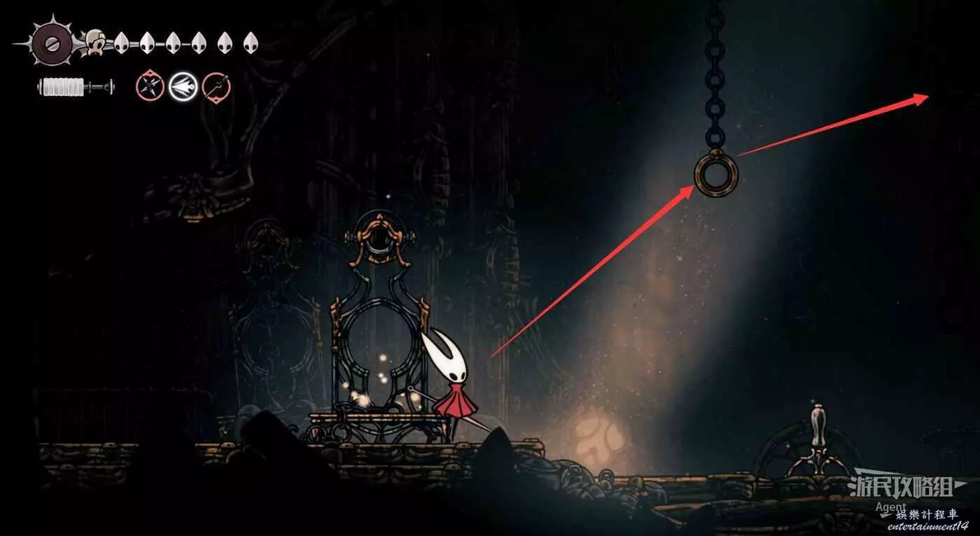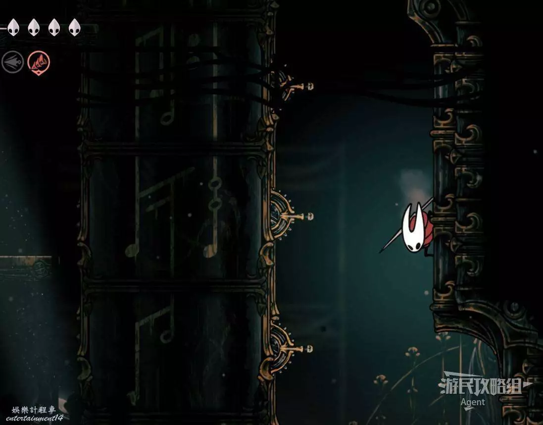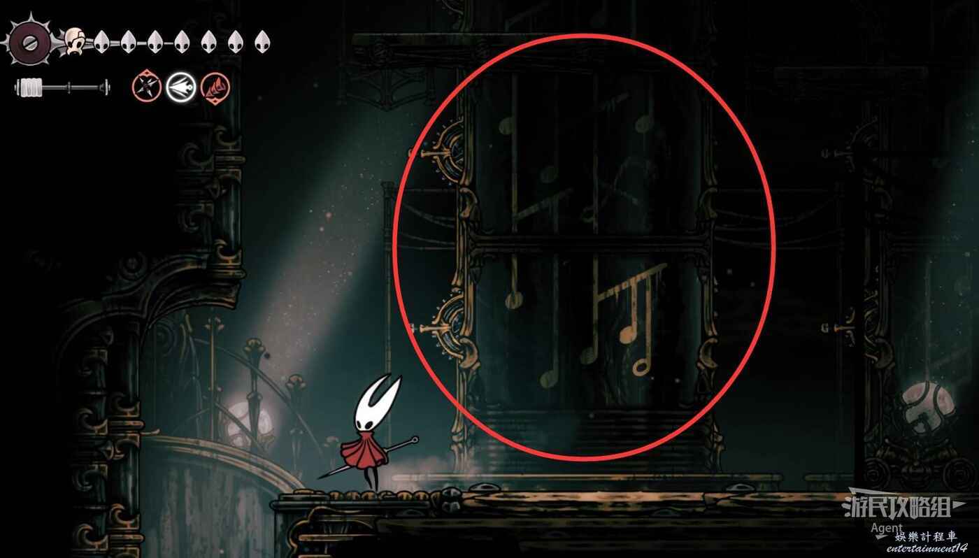 戰鬥結束後看到天花板上有個蓋子,剛才失格大廚就是從這出來的,刷新地圖後再來發現蓋子沒了。爬在右邊牆上,跳起來飛針衝刺,然後二段跳可以上去失格大廚的房間,裡面沒什麼東西不去也行,彈琴會有歌詞。