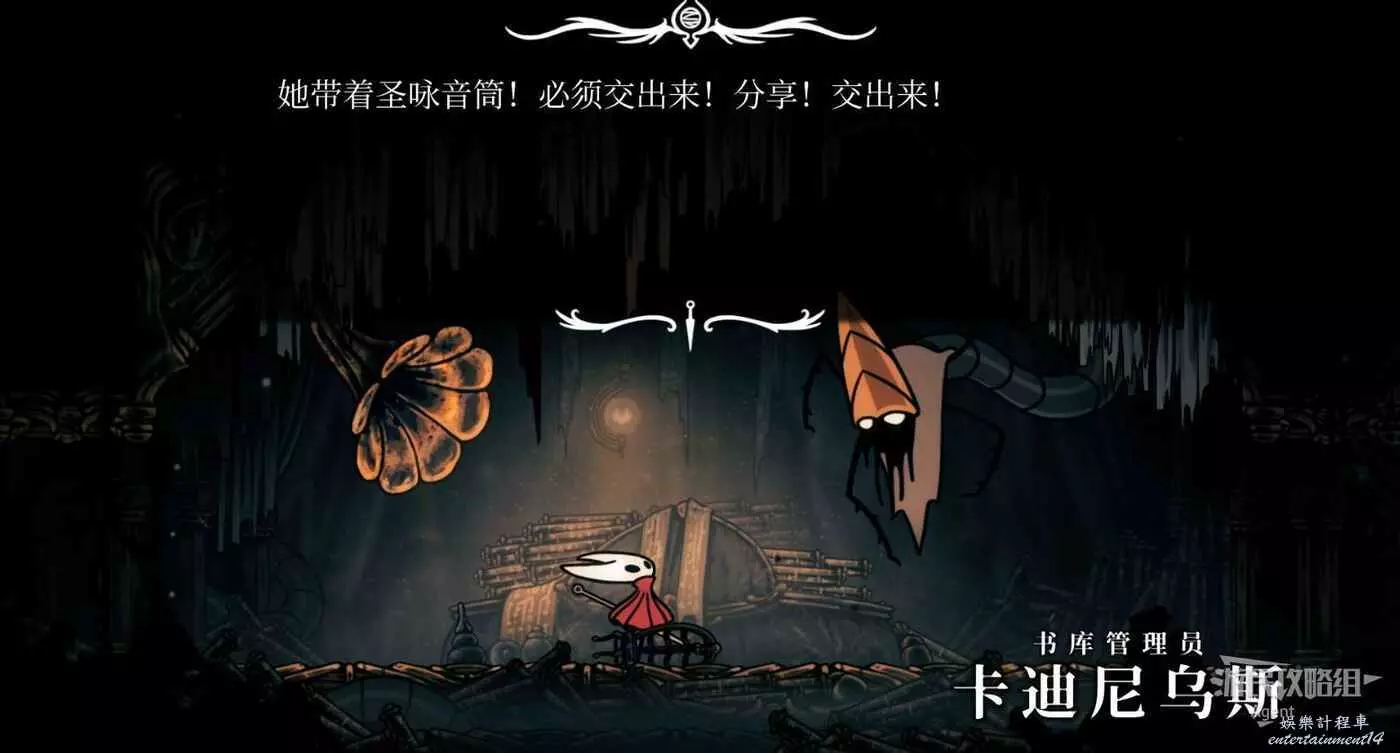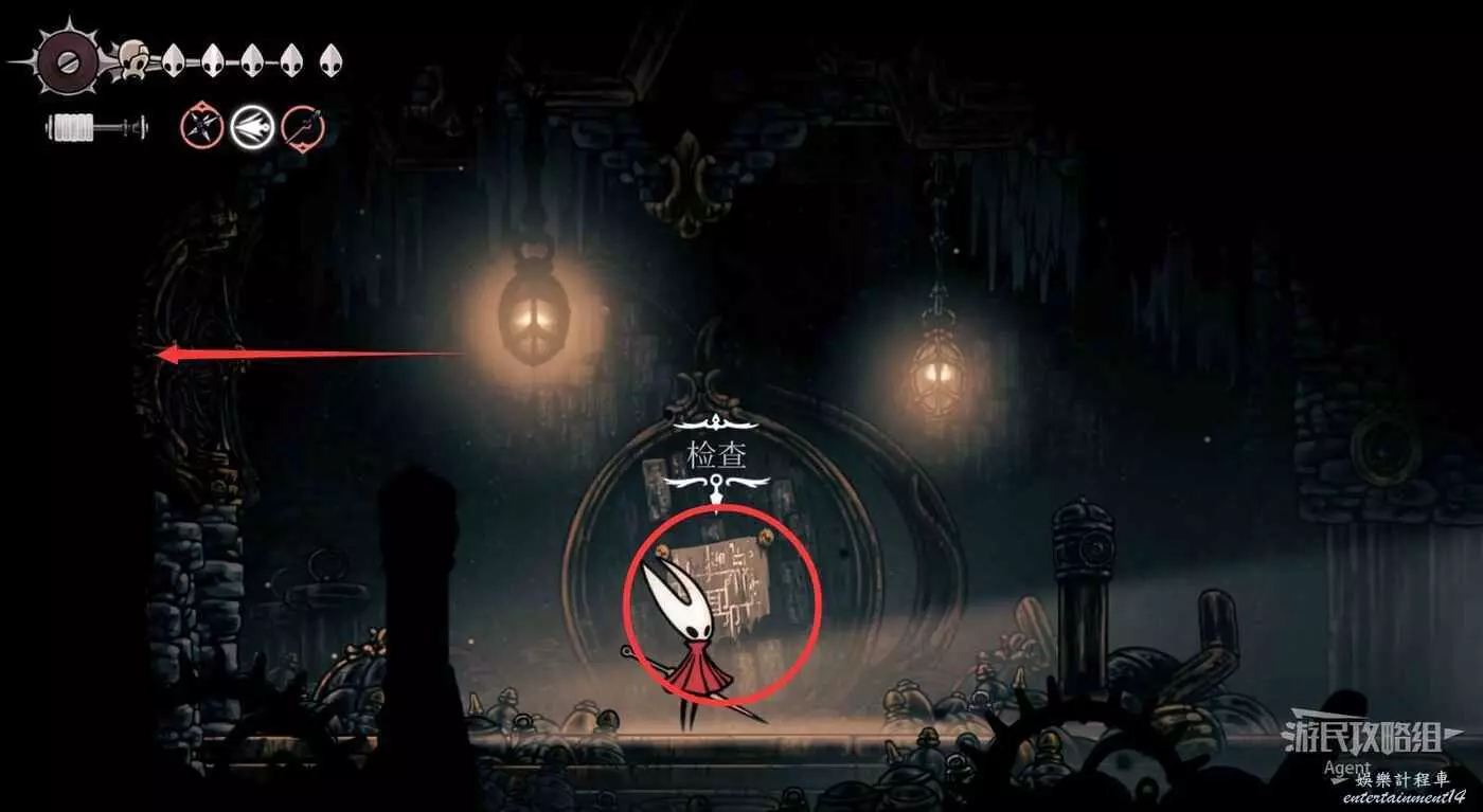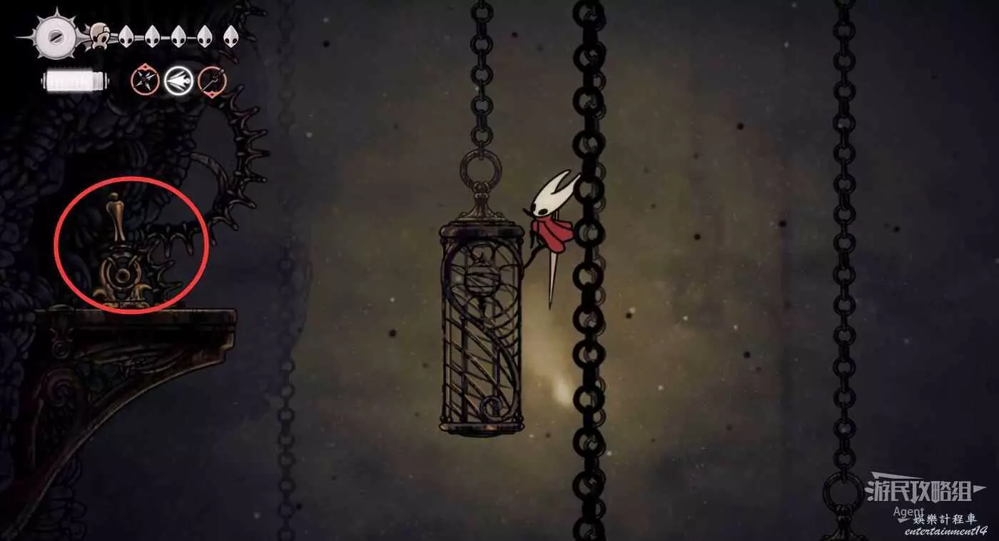 戰鬥結束後看到天花板上有個蓋子,剛才失格大廚就是從這出來的,刷新地圖後再來發現蓋子沒了。爬在右邊牆上,跳起來飛針衝刺,然後二段跳可以上去失格大廚的房間,裡面沒什麼東西不去也行,彈琴會有歌詞。