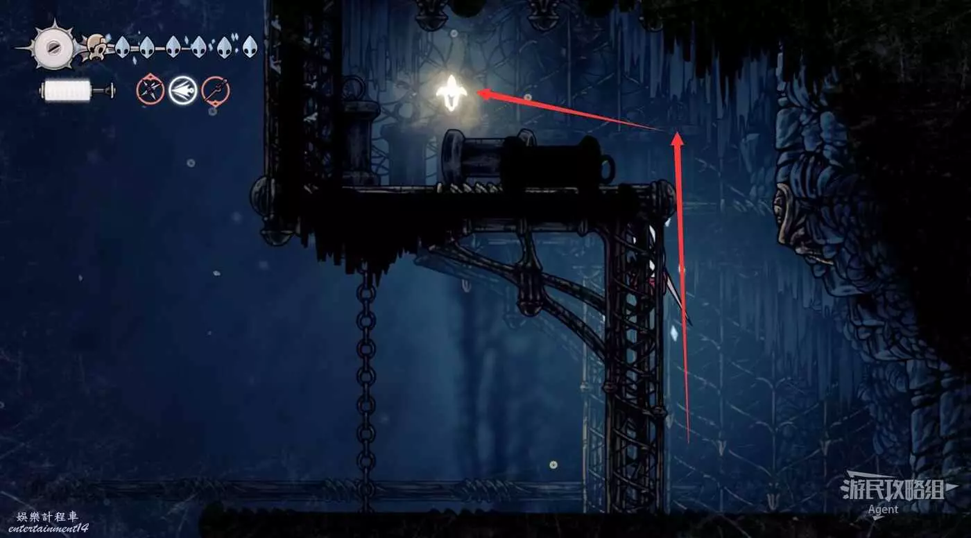 繼續往上,往左來到豎井,敲拉杆放下籠子打通上下的捷徑。