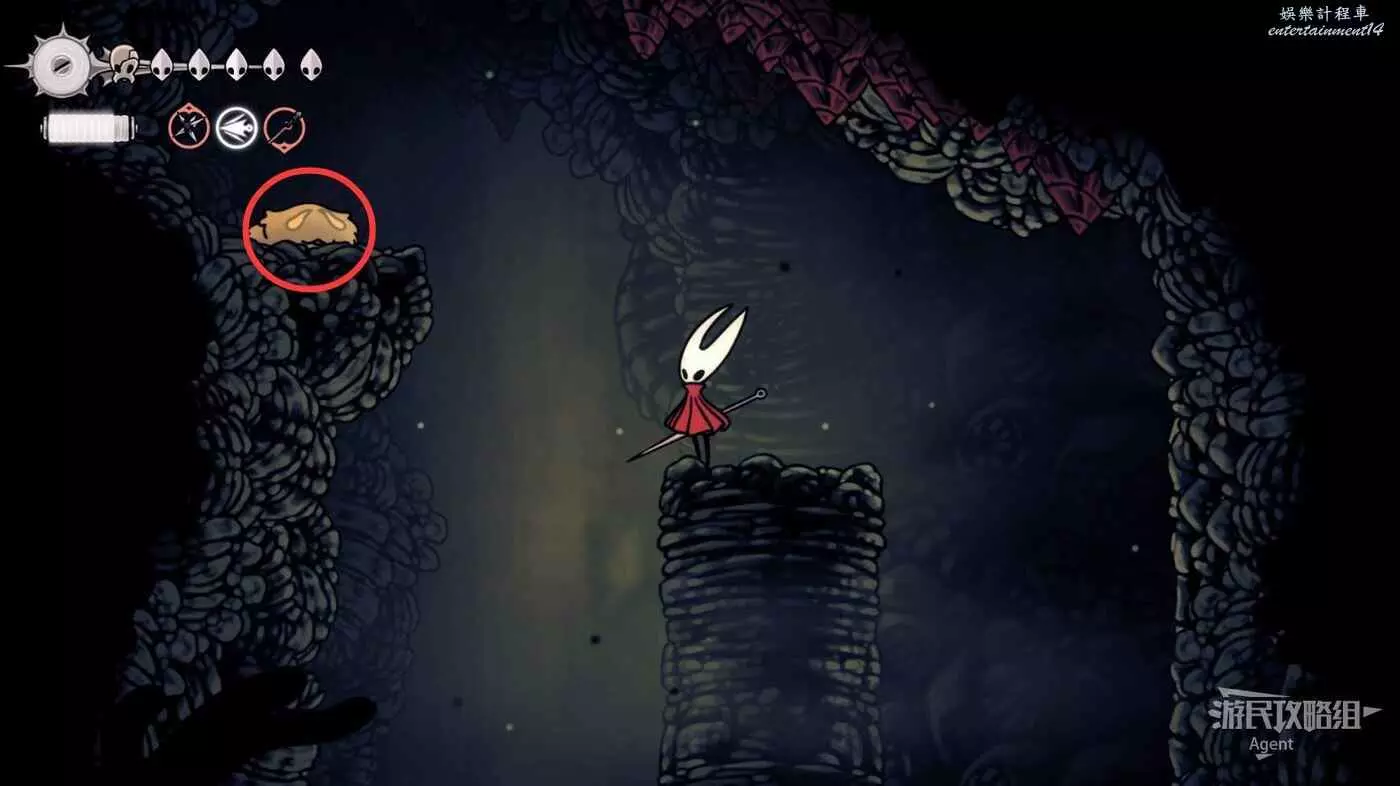 往右走,牆後面隱藏的洞裡有些靈絲補給。往下打通回長椅的路。