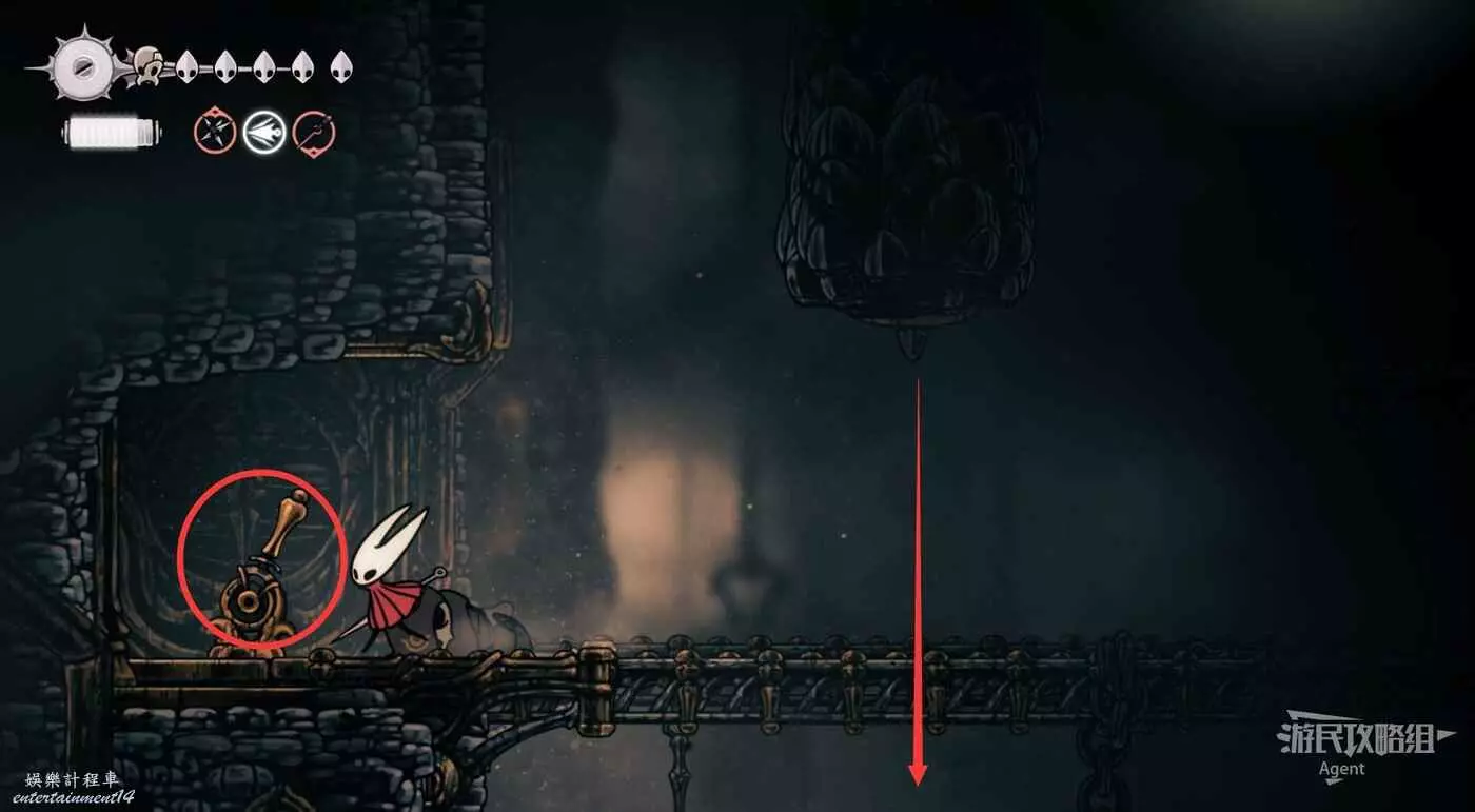 下劈鐵環過來後,從第一個地面缺口下去敲拉杆放下平臺打通捷徑。
