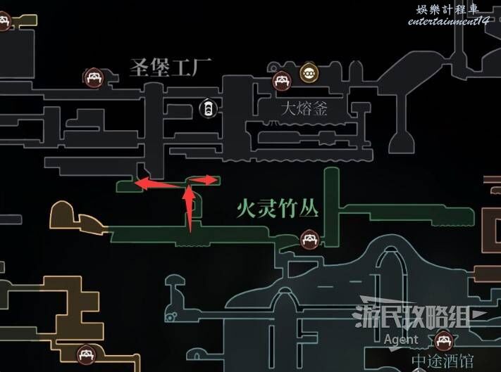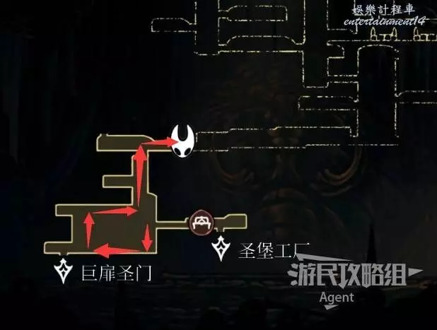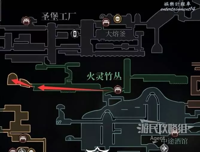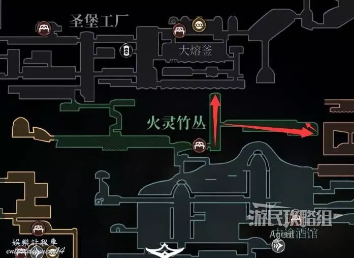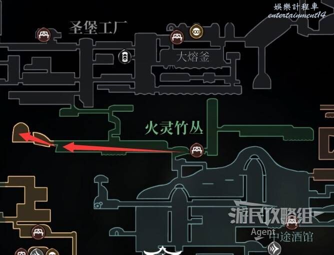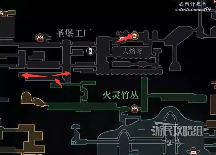 往上走,高處左邊拿到【聖堡工廠地圖】,繼續往左進入隱藏的洞裡有骨卷軸。