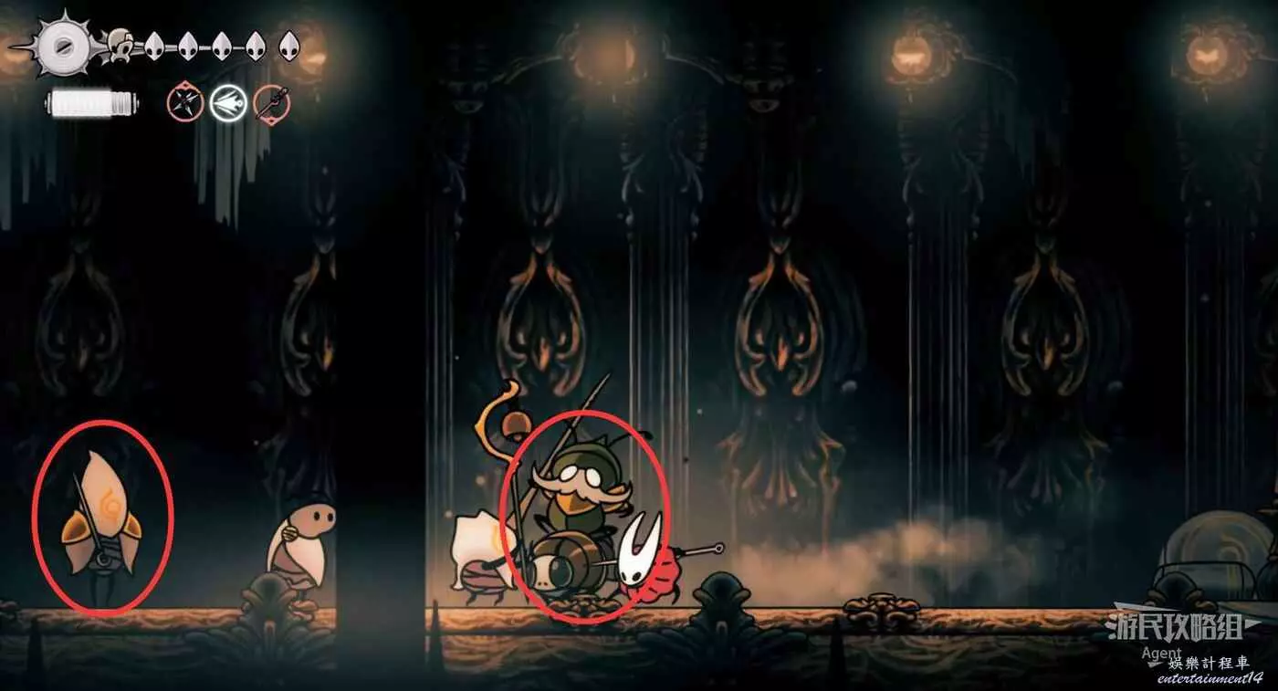 右邊岔路走到頭有只跳蚤。左邊三個岔路分別有靈絲販賣機、敲鐘謎題、小偷格林德爾。