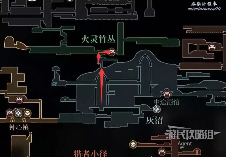 下到底,去左邊打蟲繭得到噬絲蛆,右邊解鎖聖堡鐘道傳送點、長椅、電梯。