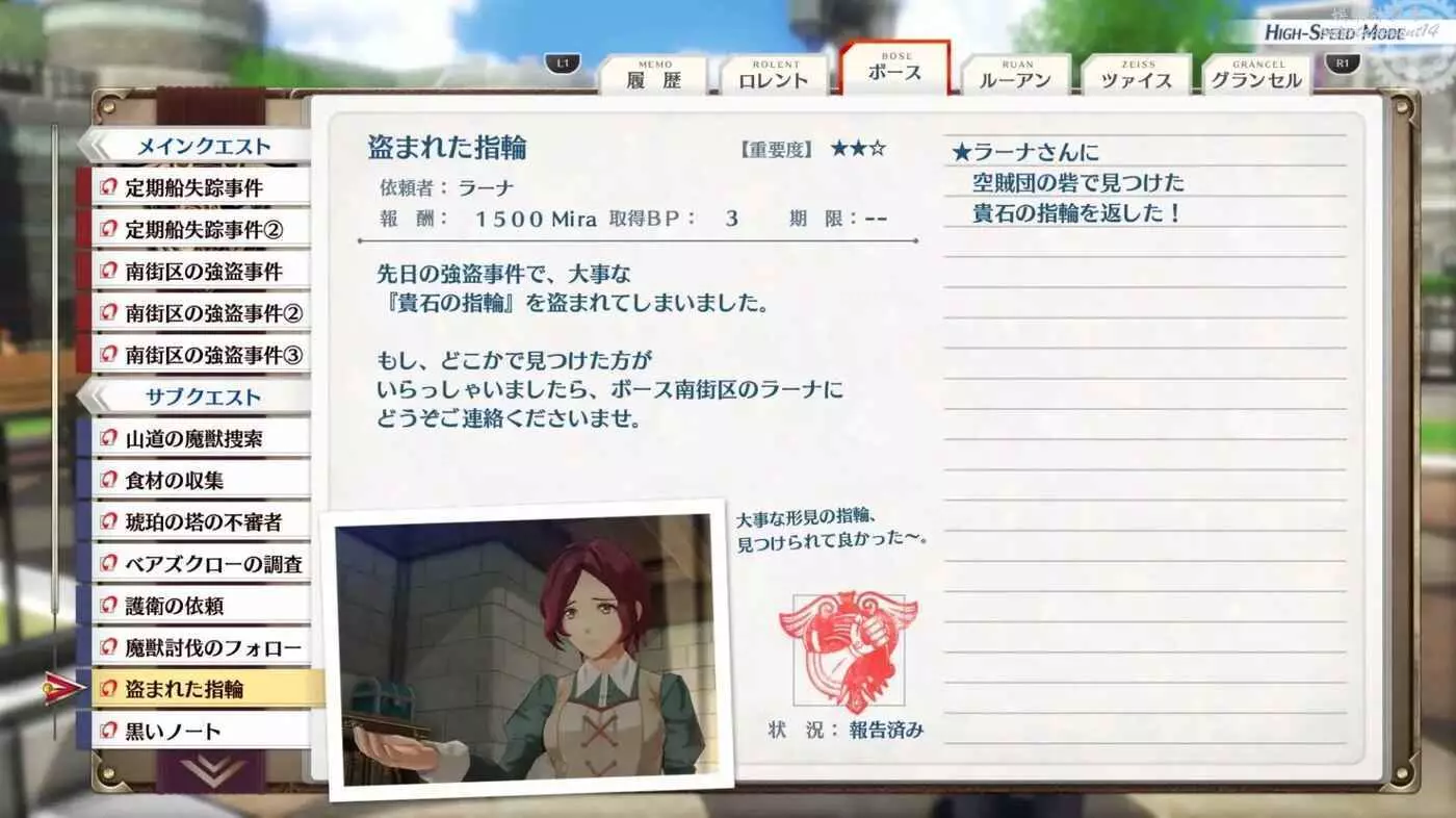 空之軌跡 the 1st 被盜的戒指支線任務攻略 21 9 月 2025-09-21 廣告 來源:kamikouryaku 被竊的戒指 此為第1章前往廢坑後,可在柏斯市遊擊士協會承接的委託。 任務期限:長,重要度:2星 報酬1500米拉,獲得3點BP 攻略流程 1.在空賊基地1樓獲得「寶石戒指」 2.前往柏斯市波爾宅與拉娜對話並交付寶石戒指 3.達成委託