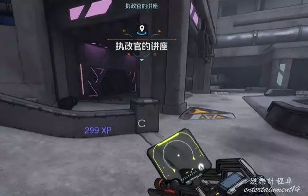 1、觸發點位如下圖所示,玩家在執政官的講座看見紫色的建築後直走。