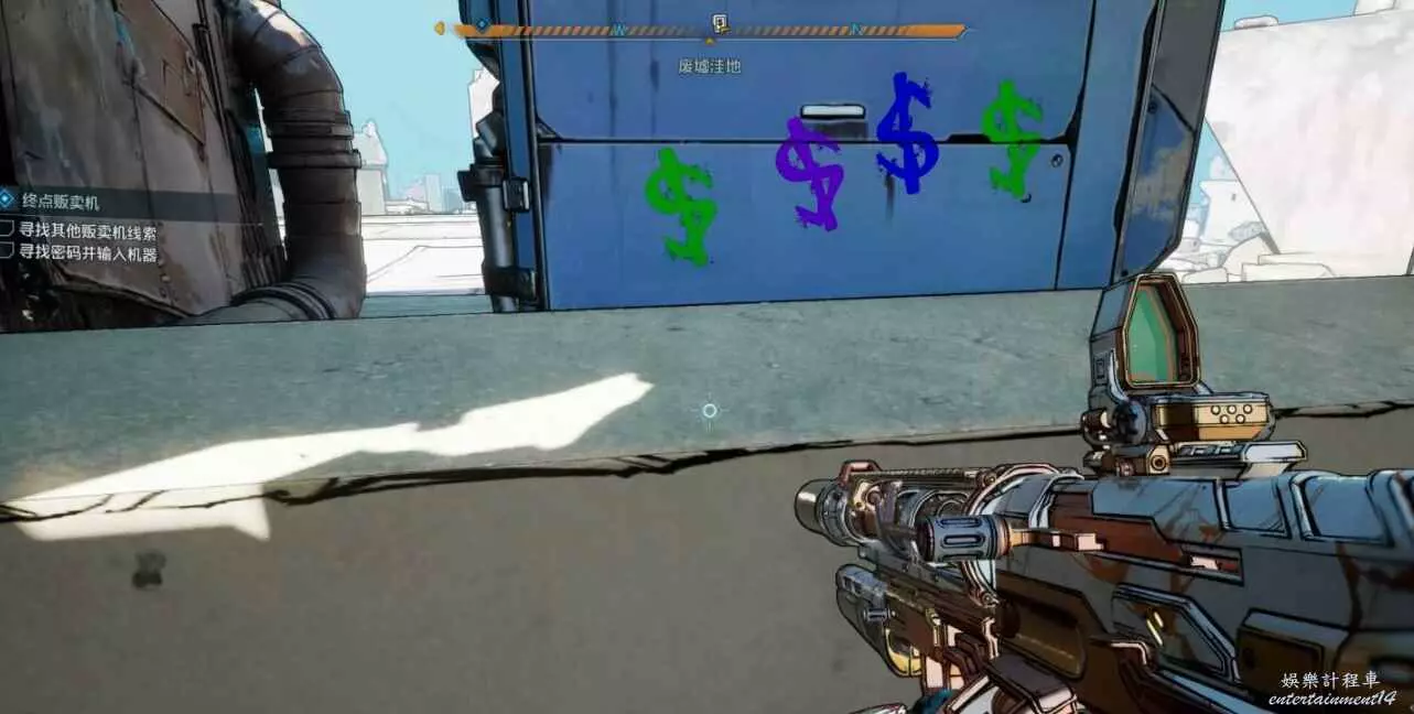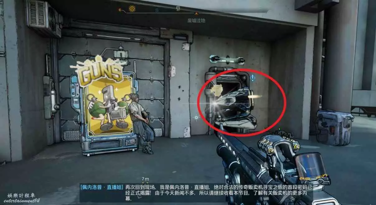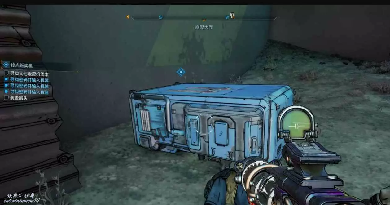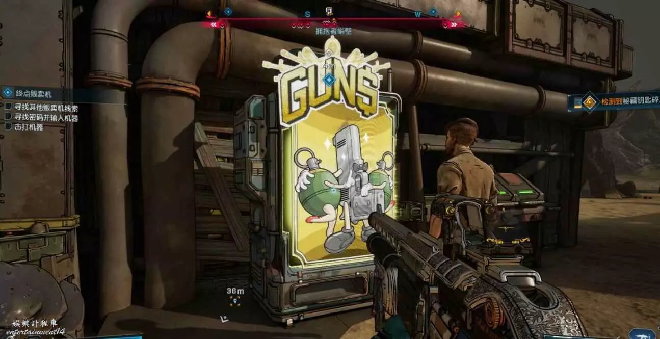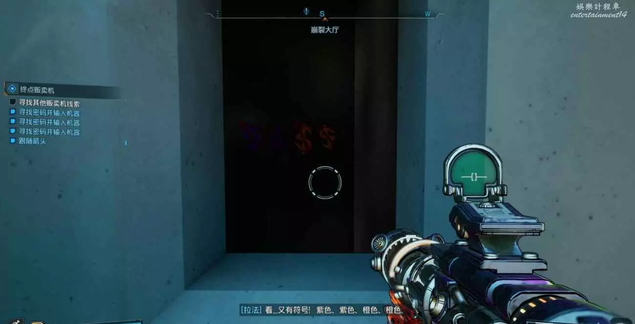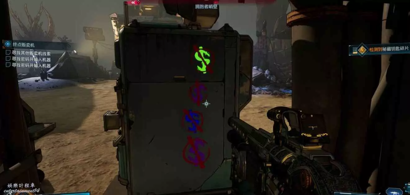 販賣機建築後方有缺口,進去查看背面獲線索。與販賣機互動,依次售賣【綠】、【紫】、【藍】、【紫】品質武器獲密碼。