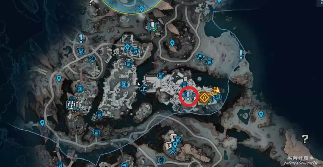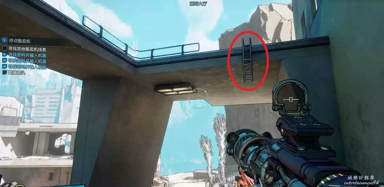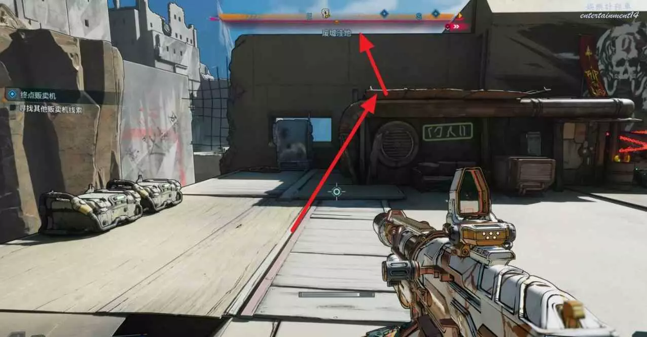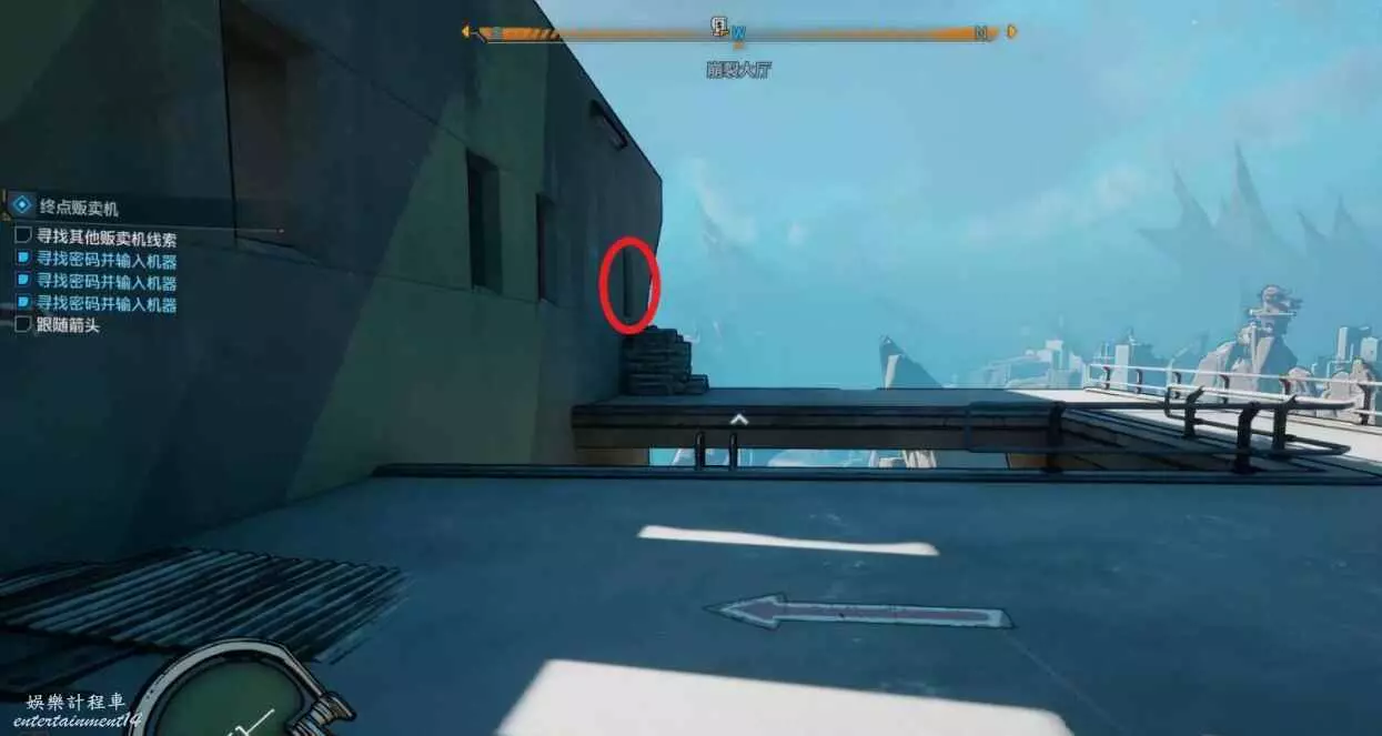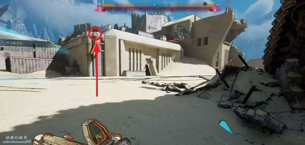 到達目的地後,與建築左上角的鉤爪點互動爬上去,能找到對應的販賣機。