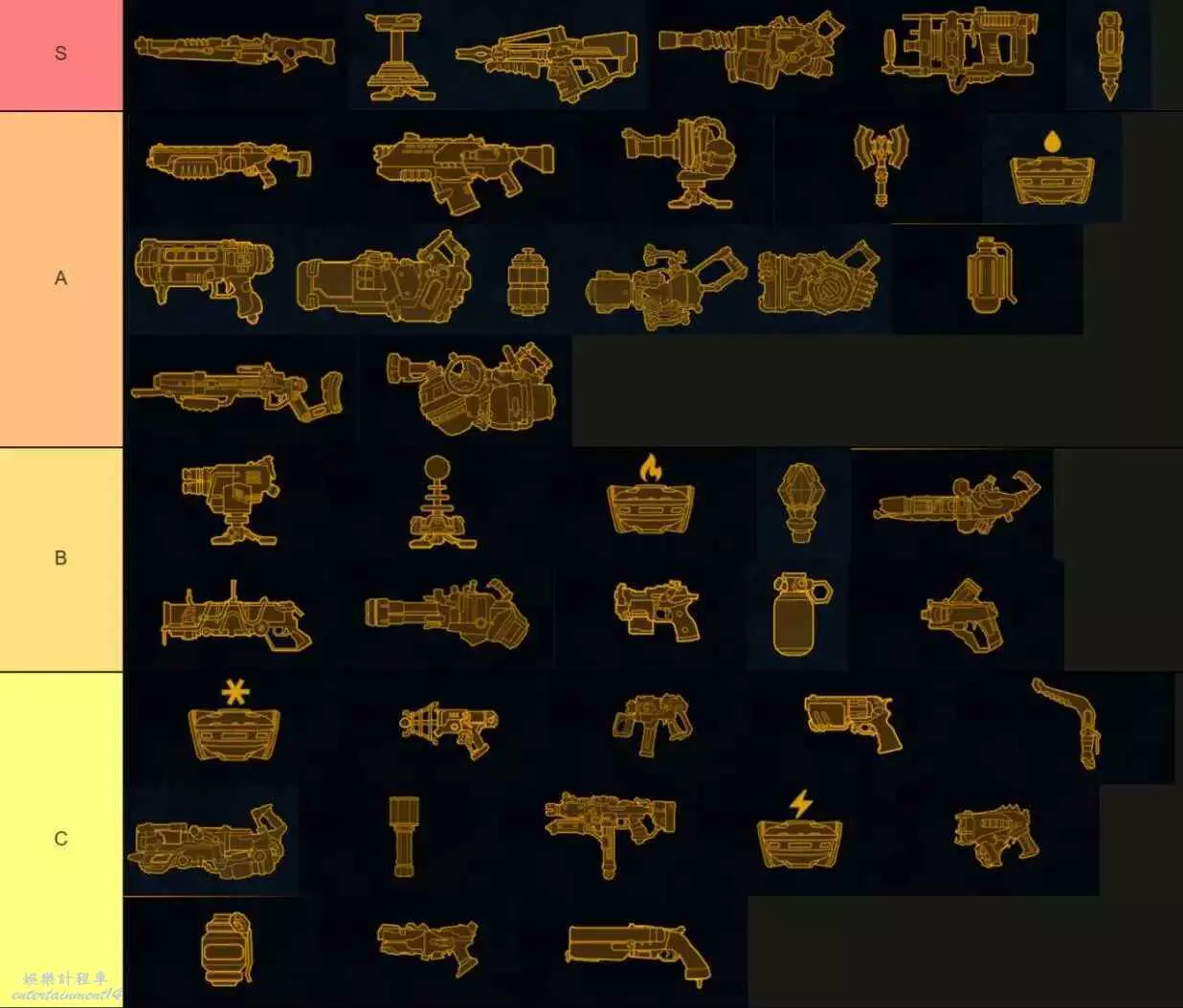 B級:堪堪可用的武器。能玩但是要麼成型困難,要麼輸出環境苛刻,要麼輸出不夠。